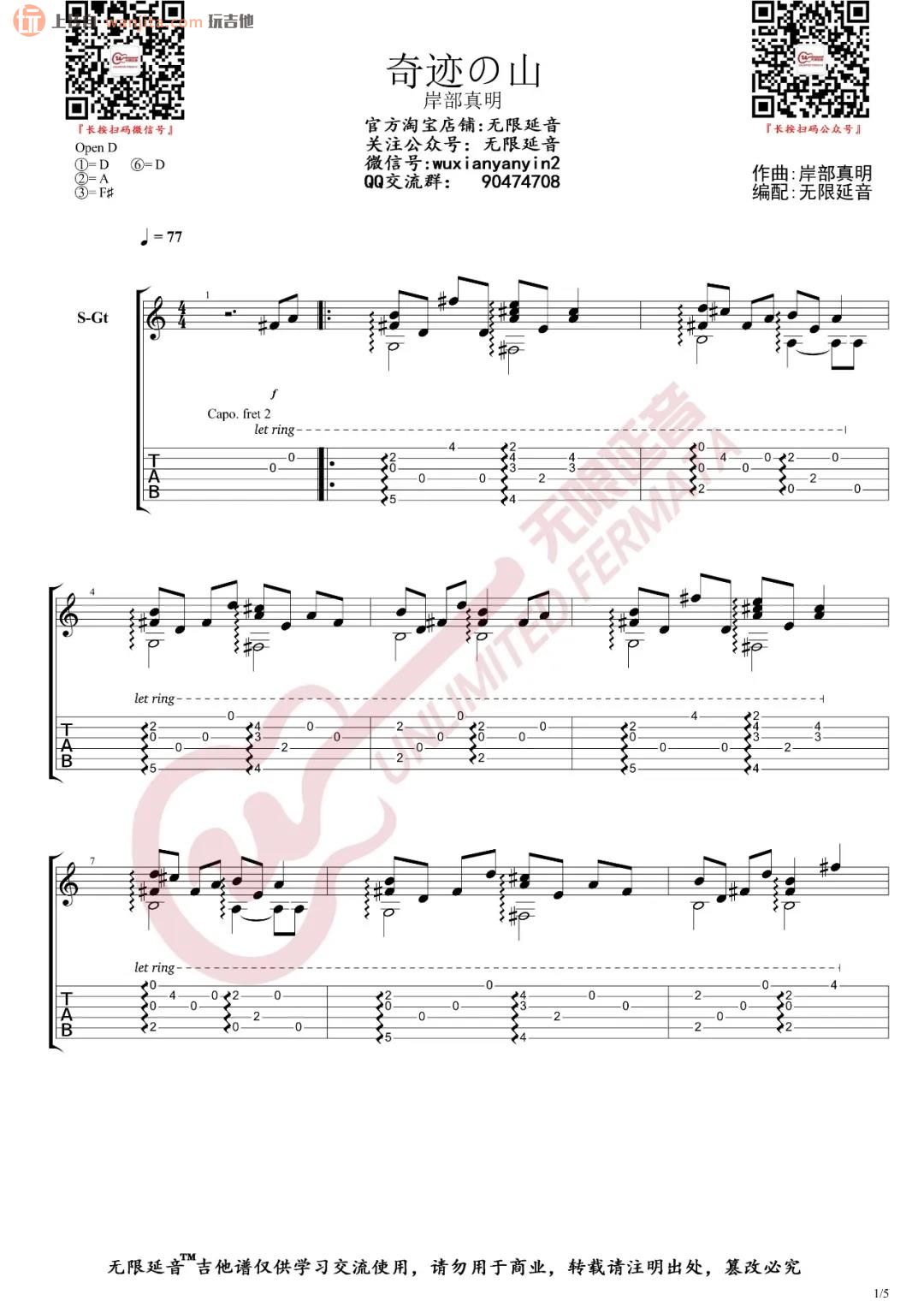 曲谱介绍: 岸部真明《奇迹的山》吉他独奏谱,采用D调指法编配,共有5张高清图谱。