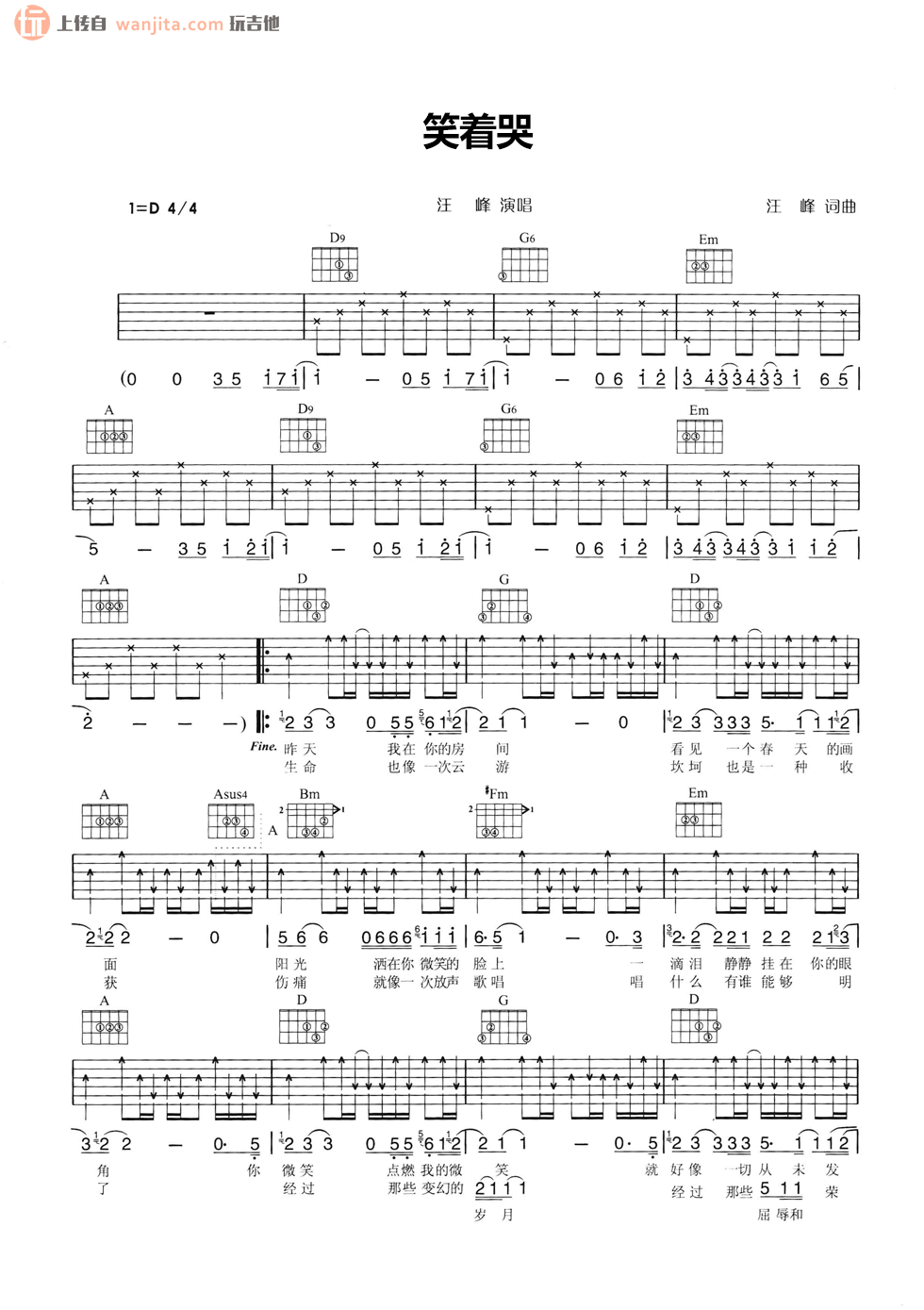 笑着哭吉他谱 - 汪峰 - D调吉他弹唱谱