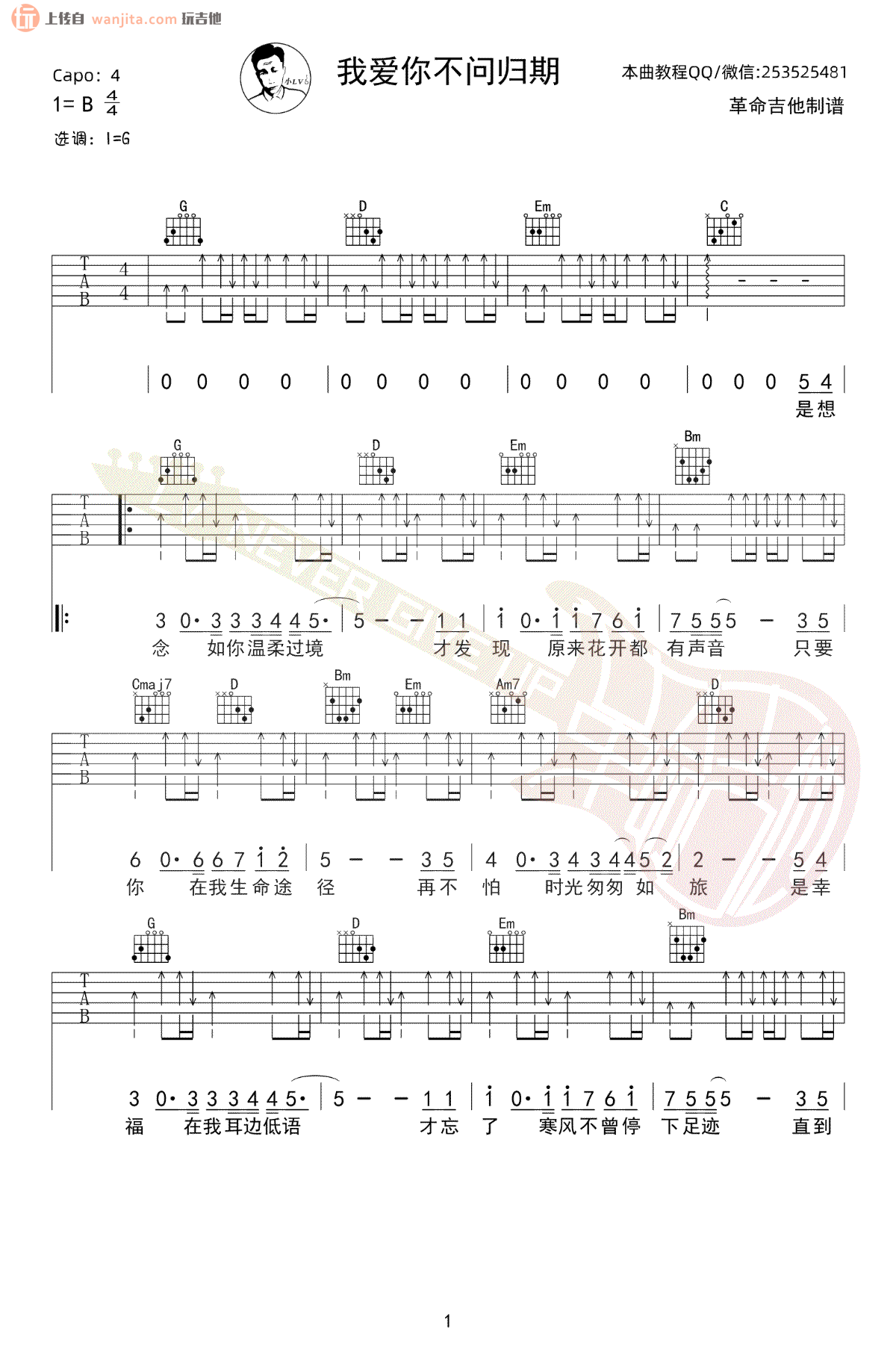 曲谱介绍: 《我爱你不问归期》吉他谱,原调是B调,选用G调编配,全程扫弦弹唱,节拍较快,新手弹唱一定要掌握好扫弦的层次感与技巧。