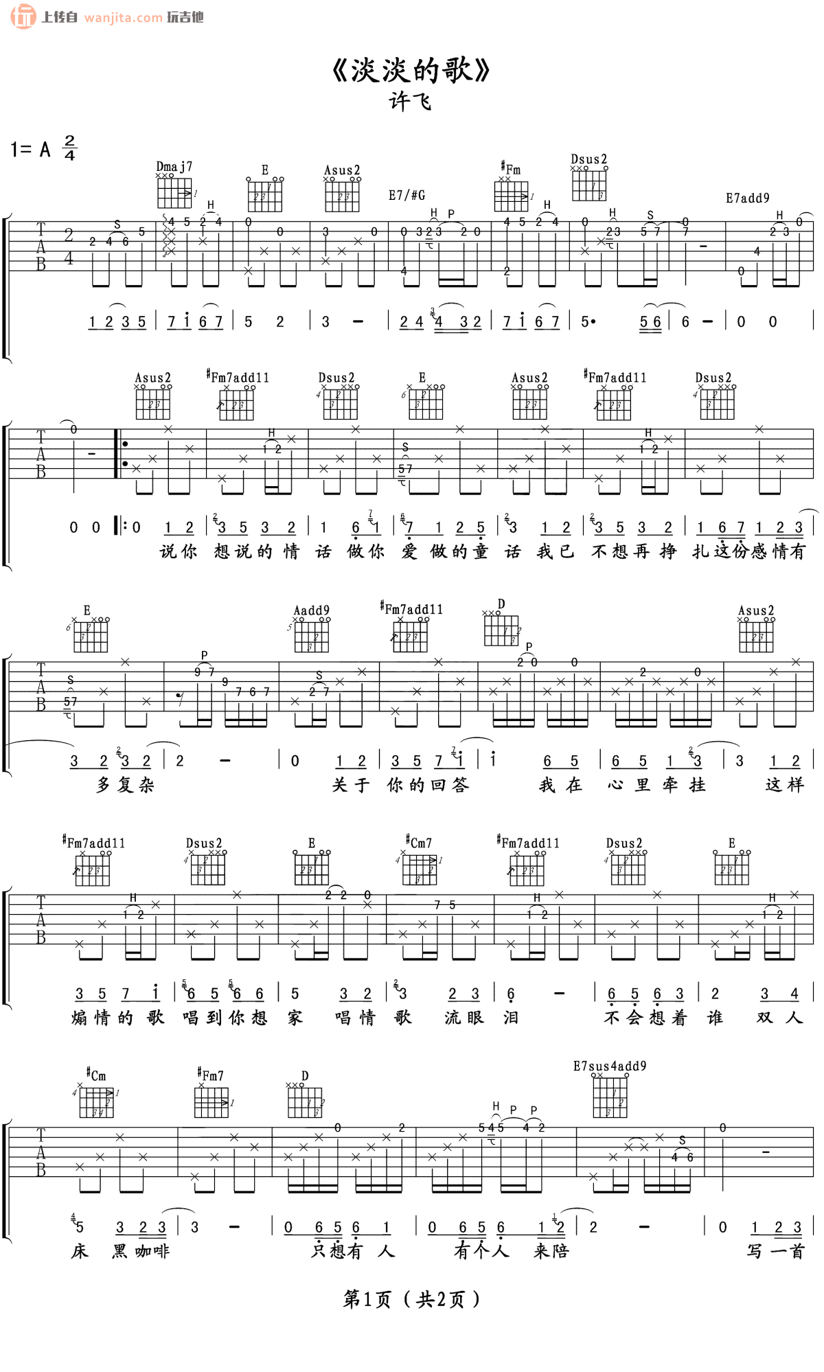 淡淡的歌吉他谱 - 许飞 - A调吉他弹唱谱 - 原版
