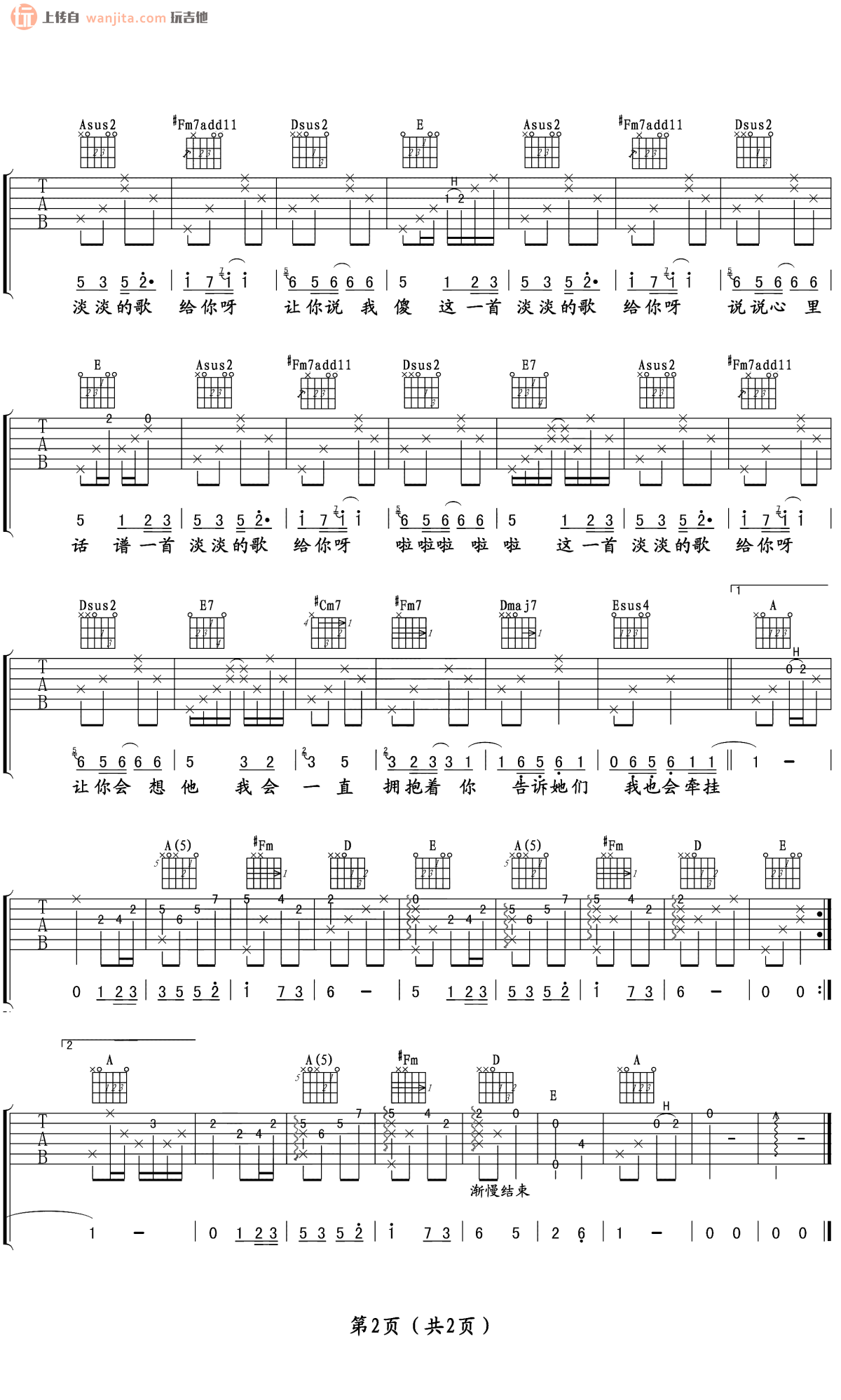 曲谱介绍: 《淡淡的歌》吉他谱,选用A调指法编配,歌曲包含了完整的前奏,指法稍有些许复杂,需要花时间去练习掌握。