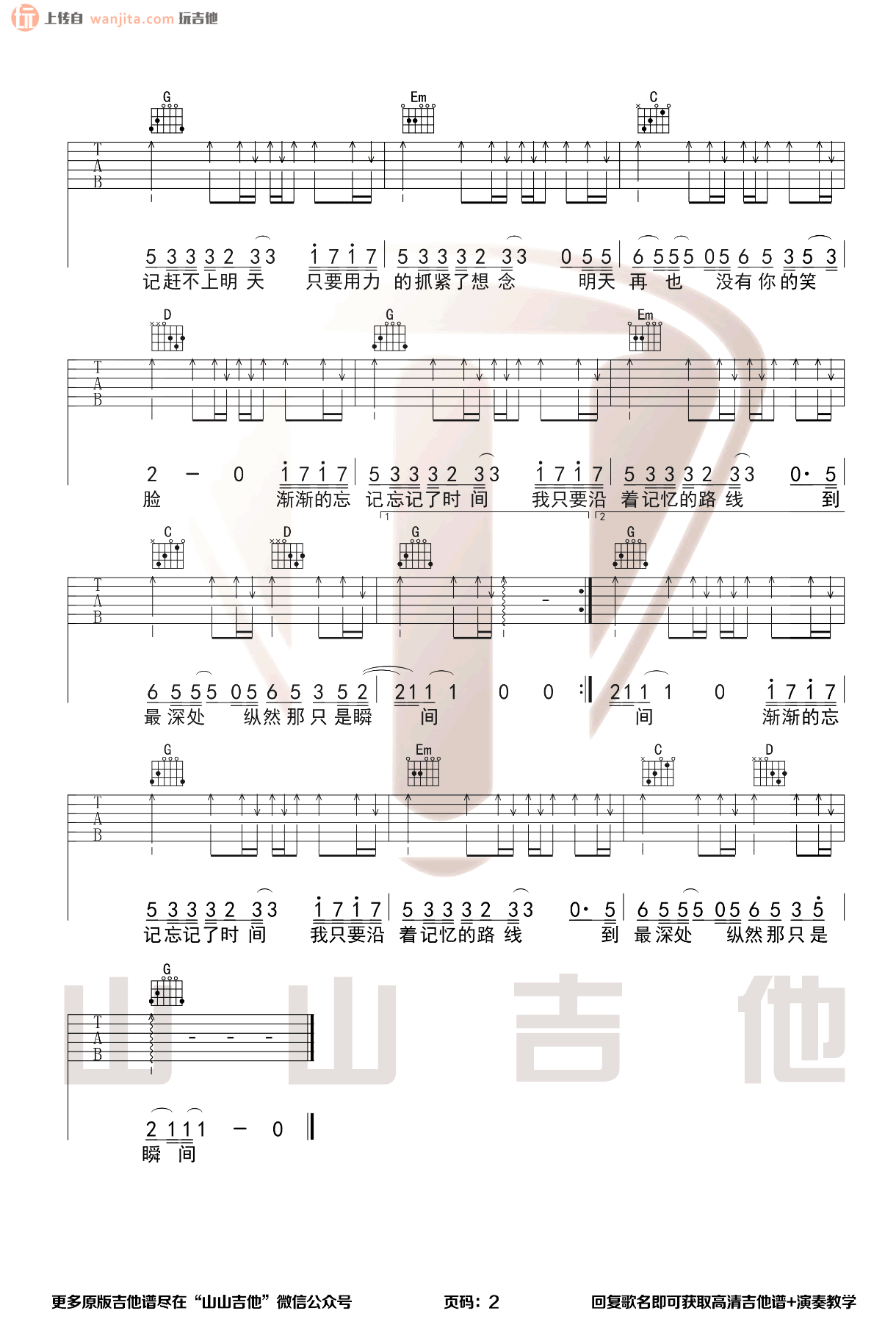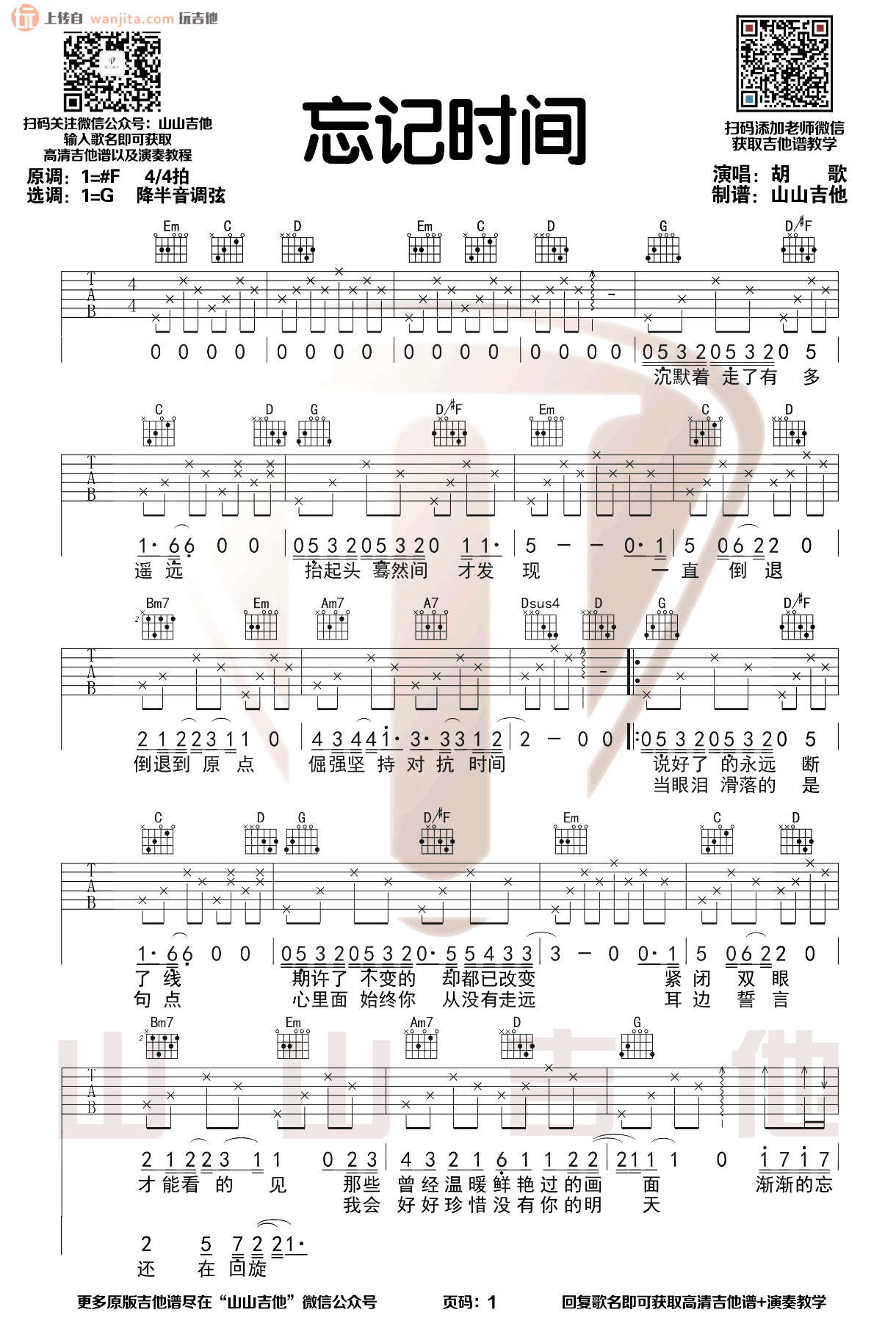 曲谱介绍: 《忘记时间》吉他谱,由山山吉他制谱分享,原调#F,选用G调编配,弹唱难度很小,新手也可以很好的上手练习。