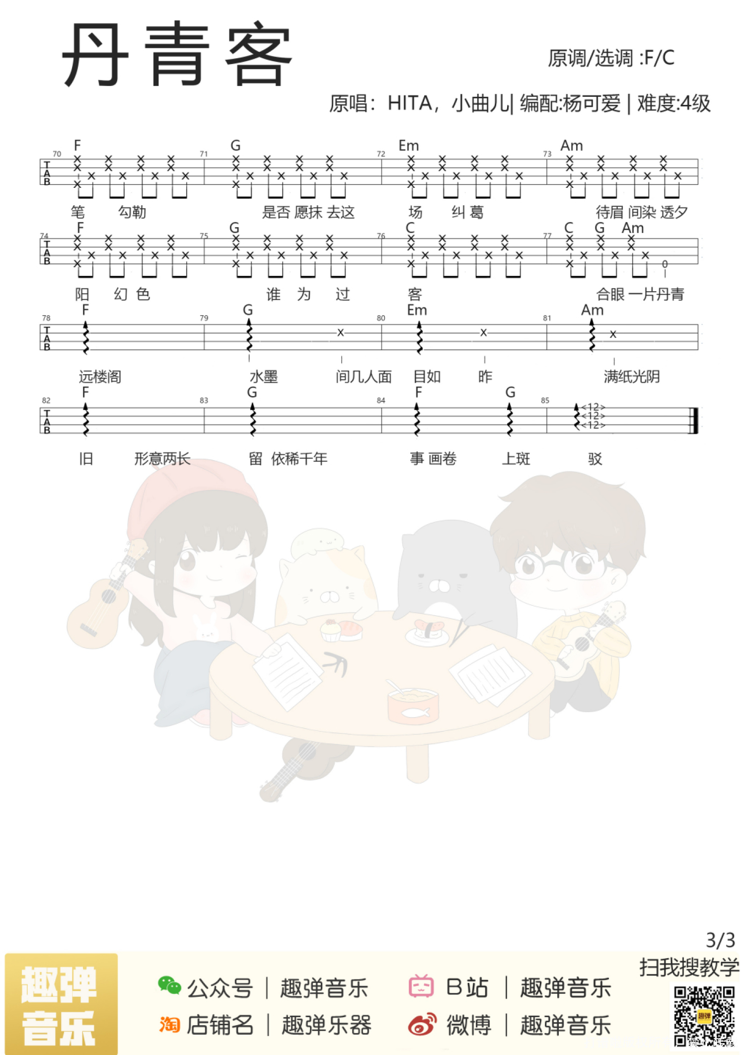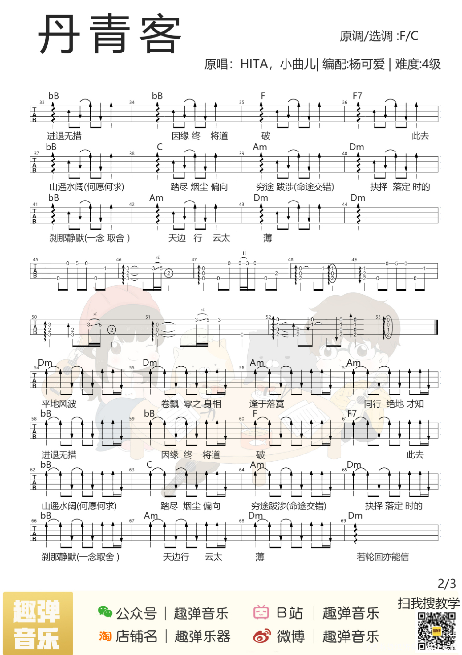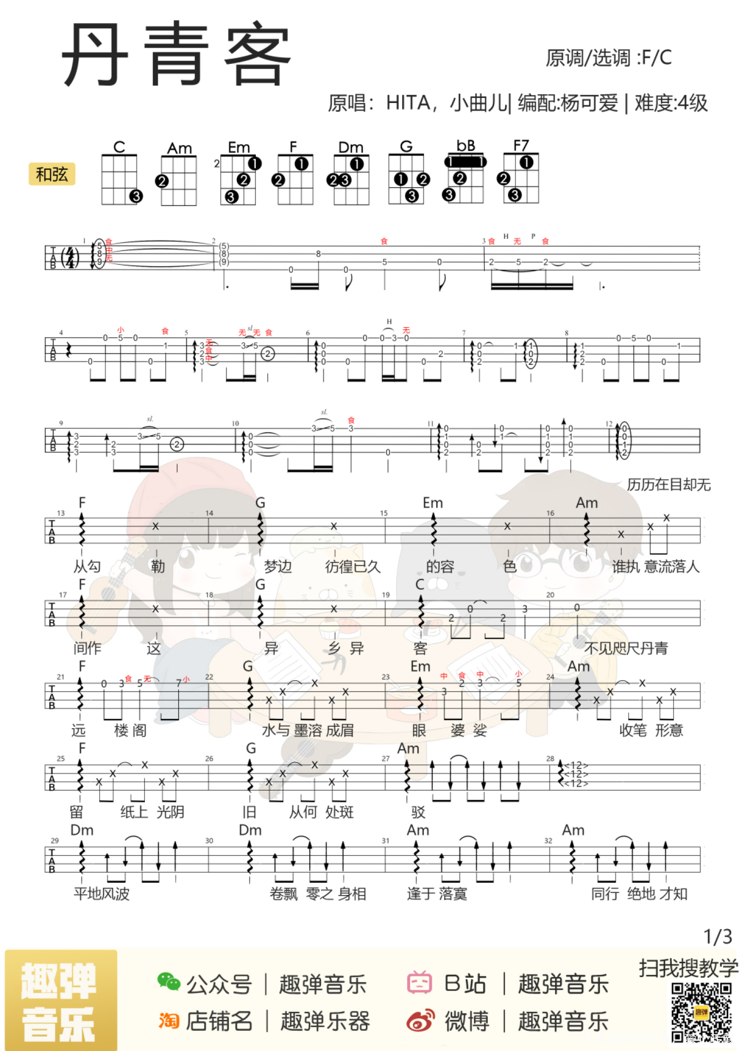 曲谱介绍: 弹唱视频 原曲介绍 教学视频 弹唱曲谱 目录 Aloha! 今天杨可爱给大家 带来了一首意境十足的古风歌 来自曲爷和塔姐的「丹青客」 悠悠旋律仿佛跃然纸上 勾勒出一幅水墨画卷   弹唱视频   原曲介绍 ▌ 丹青客 ▌ HITA&小曲儿 游戏《倩女幽魂2》画魂职业主题曲。   ▌ 杨可爱有话说 在这首「丹青客」的弹奏中,我使用了击勾弦技巧和几种节奏型,使这首歌更加婉转动听,在视频中我会给大家详细讲解~ 技巧课堂第二课-击勾弦技巧   教学视频   吉他伴奏下载(百度网盘) 小伙伴们练熟后,就可以配上伴奏弹啦♪ https://pan.baidu.com/s/1U0Ju8UGMnMCxWoiME-qWCA   弹唱曲谱