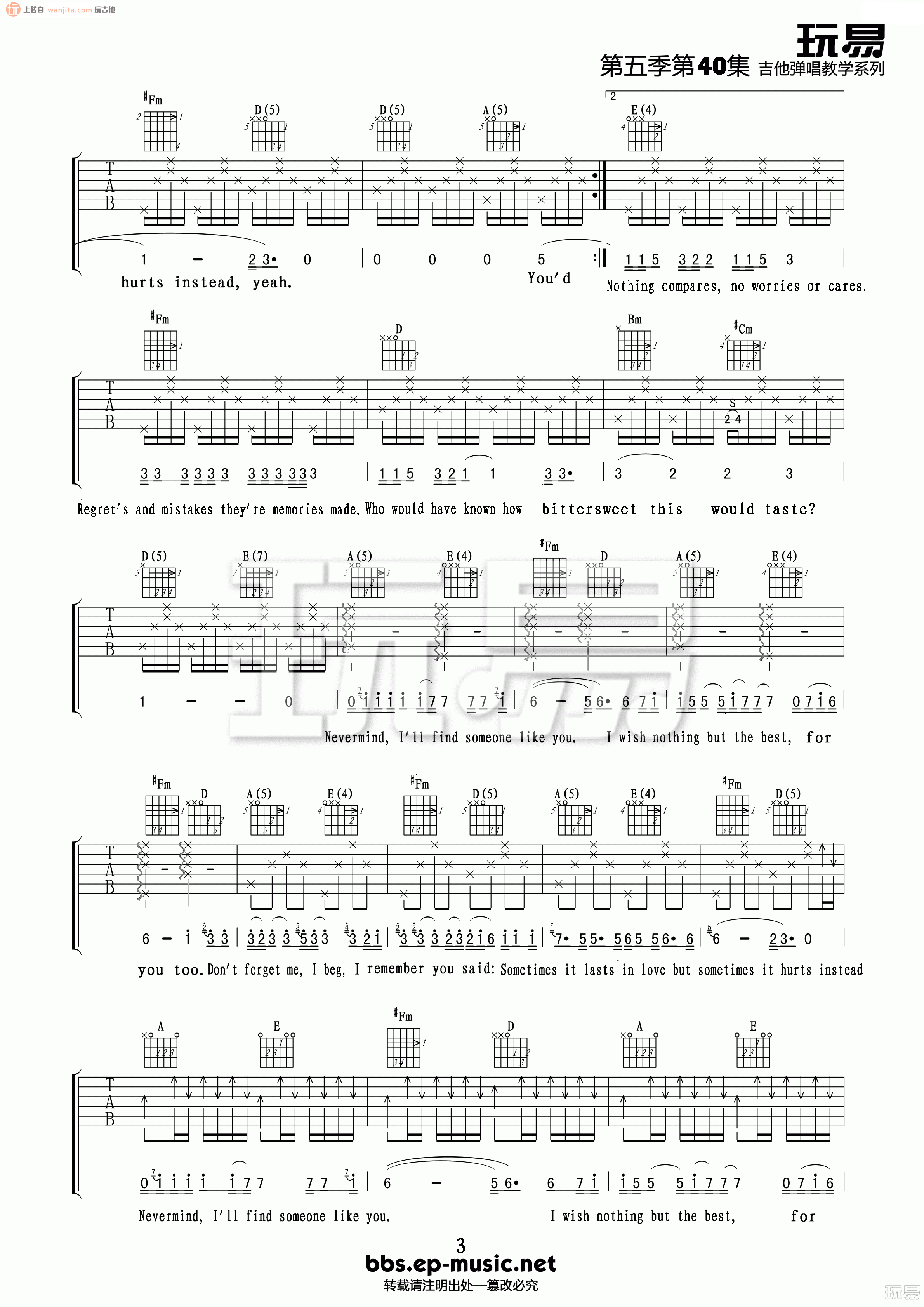 曲谱介绍: 《Someone Like You》吉他谱选用A调指法编配,左手和弦的跨度还是有一定难度,一定要掌握的是节奏与弹唱部分的融合度,也是这首歌曲最难的部分。