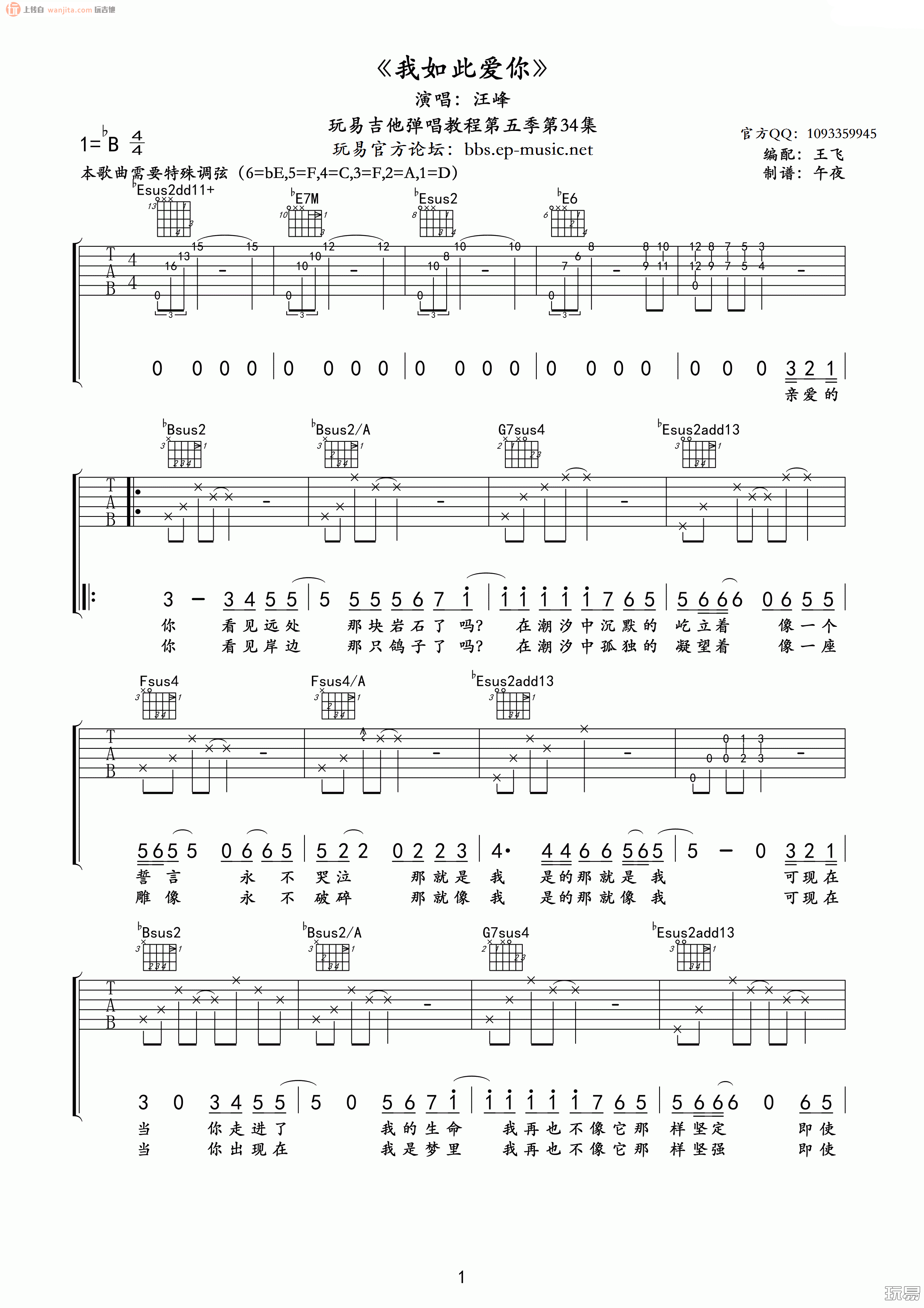 曲谱介绍: 《我如此爱你》吉他谱,选用bB调指法,这首歌曲需要特殊调线,具体方式可以详见曲谱,对于弹唱来说,这首歌由一定难度,建议中级以上水平的同学练习更加合适,其他同学可以选择这首歌另外一个版本的链接弹唱。