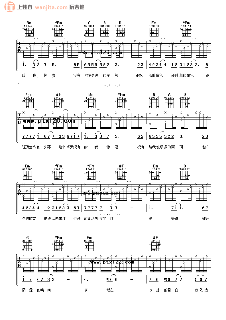 曲谱介绍: 《一个人的冬天》吉他谱,原版是D调,本曲谱总共3张高清图片普,选用D调指法编配,弹唱难度适中,节奏上有一些许细节变化,需要花一点时间练习练习。
