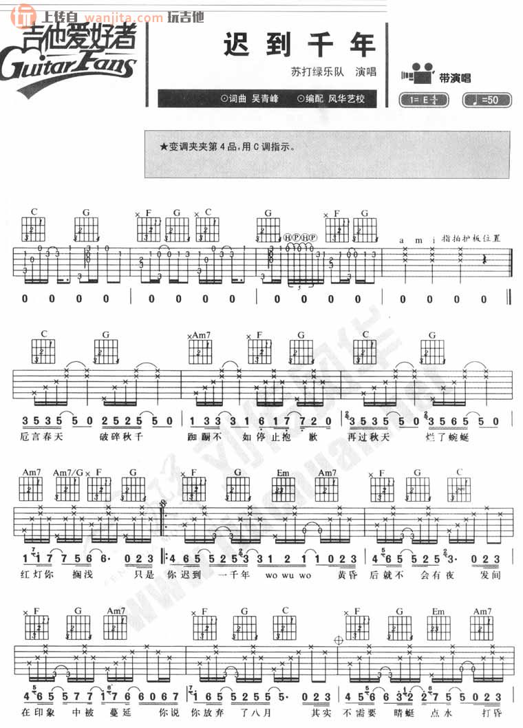 曲谱介绍: 《迟到千年》吉他谱原调是E调,由吉他爱好者制谱,选用C调指法编配,变调夹夹4品弹唱原调,这个版本有一定难度,初学者可能难以掌握的是节奏的变化。