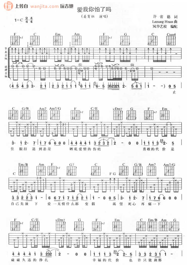 曲谱介绍: 《爱我你怕了吗》吉他谱,由风华艺校选用C调指法编配,但整首歌曲节奏和和弦变化还是比较多,需要细心的去掌握,前奏包含了双击他的节奏部分,会让整首歌曲更加完整