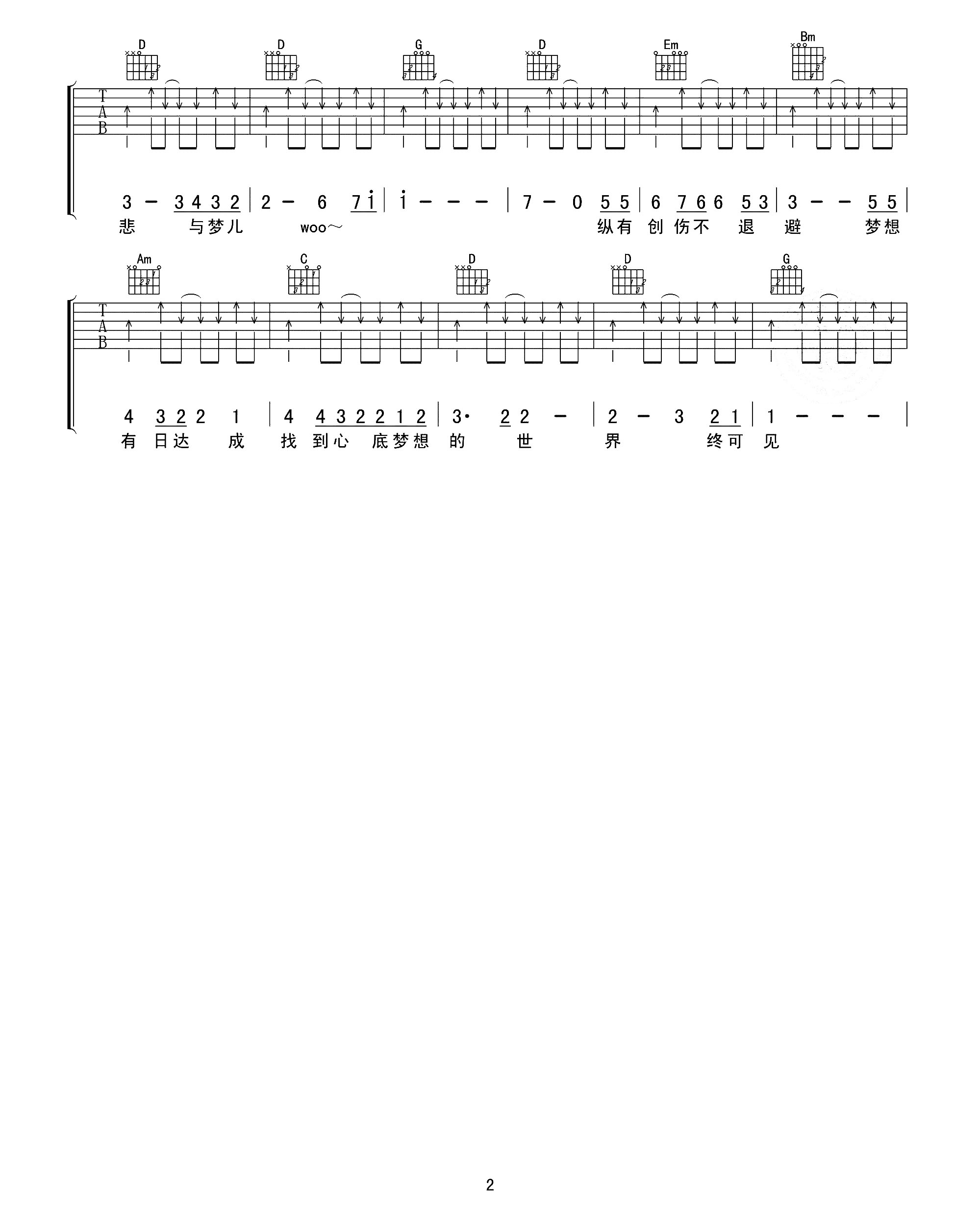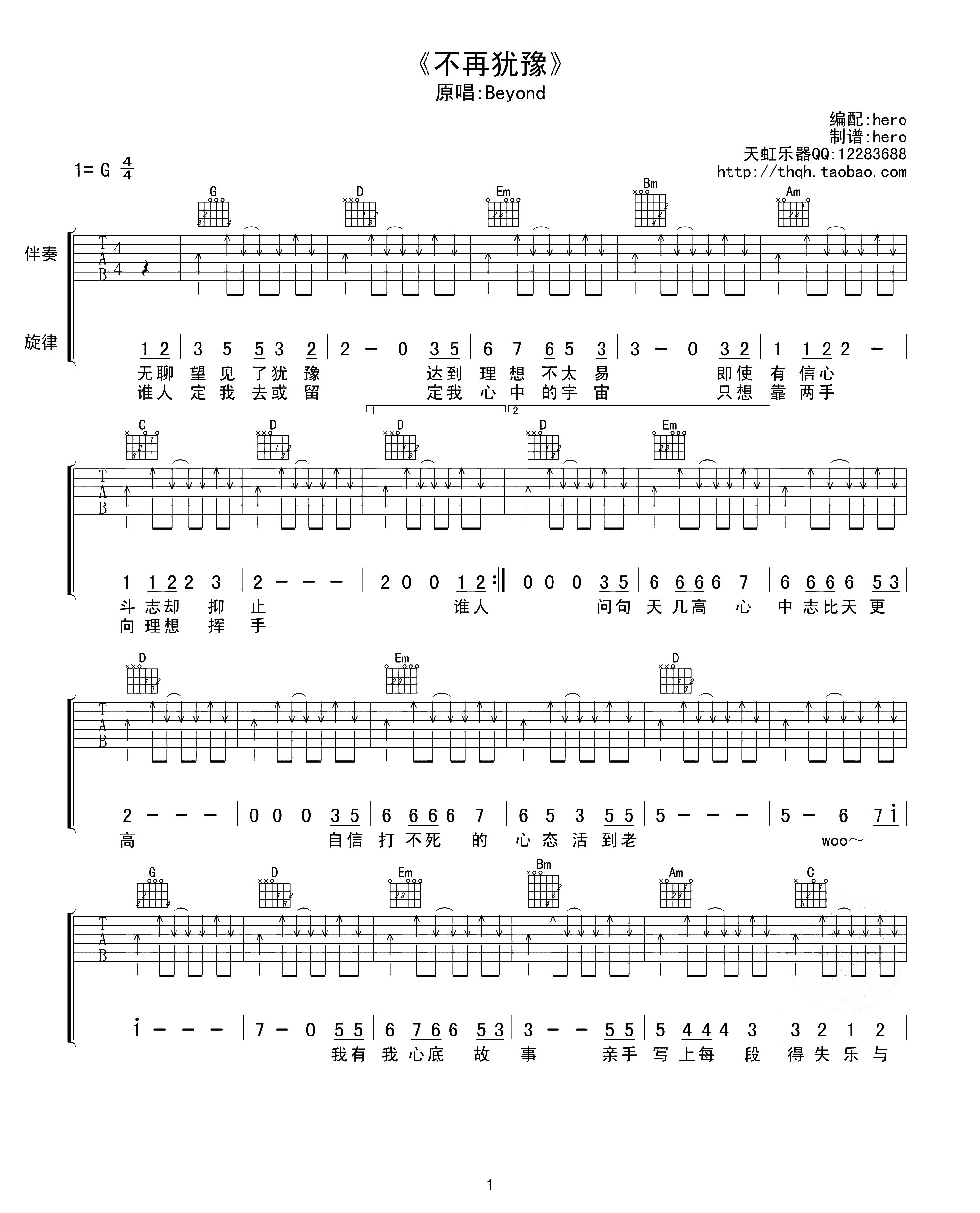 曲谱介绍: Beyond《不再犹豫》吉他弹唱谱,采用G调指法编配原版,共有2张高清图谱,免翻页排版设计。