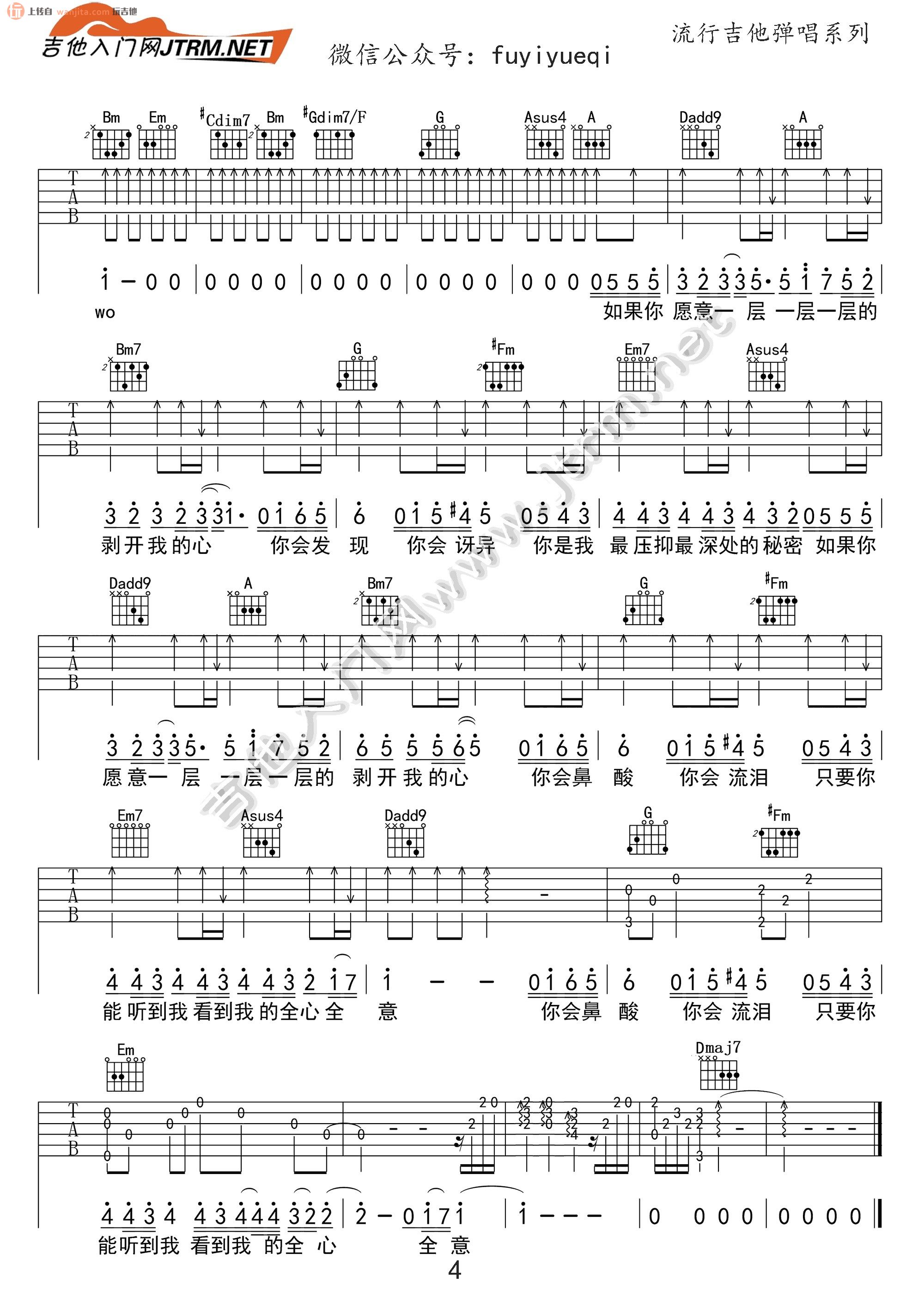 曲谱介绍: 《洋葱》吉他谱,总共4张高清图片谱,选用D调指法,原调是F调,如果弹唱原调就夹变调夹3品即可,整个谱子比较完整,大家可以认真的细磨,把握好每个环节,就可以完整的弹好这首歌曲,建议可以优先参考一下弹唱视频教学,会更加利于避免走弯路。 《洋葱》吉他弹唱教学视频
