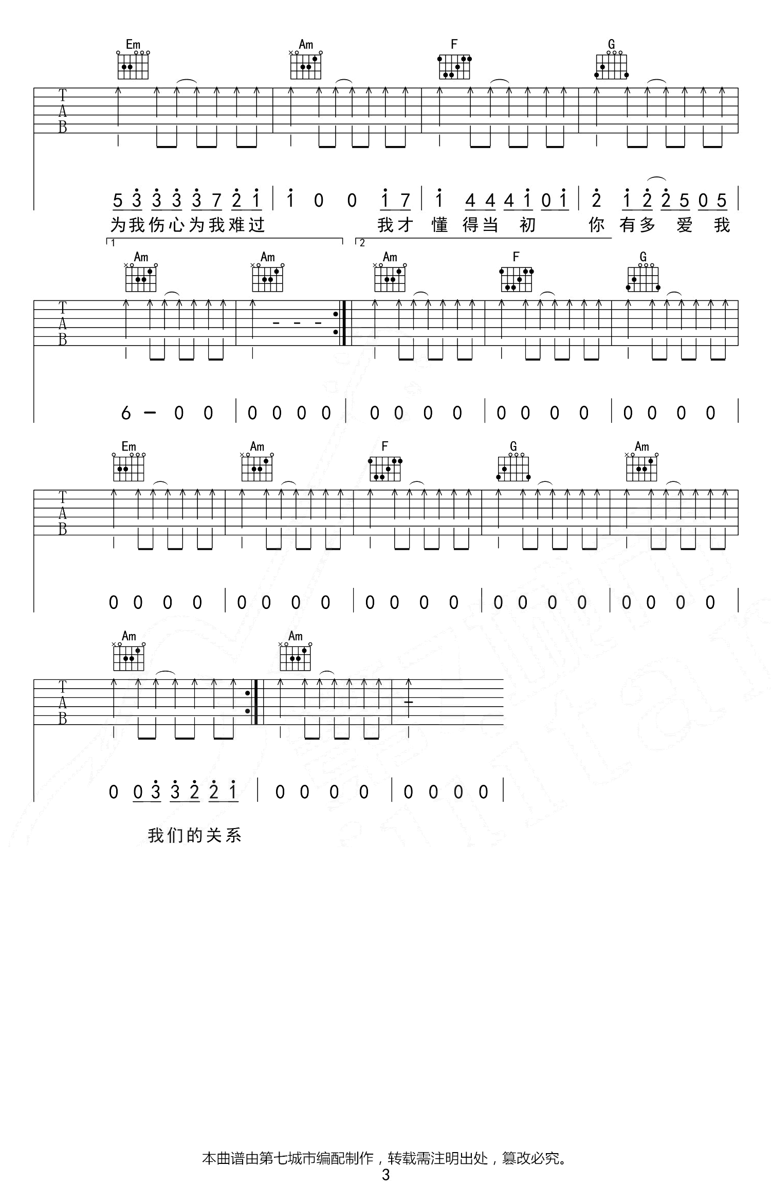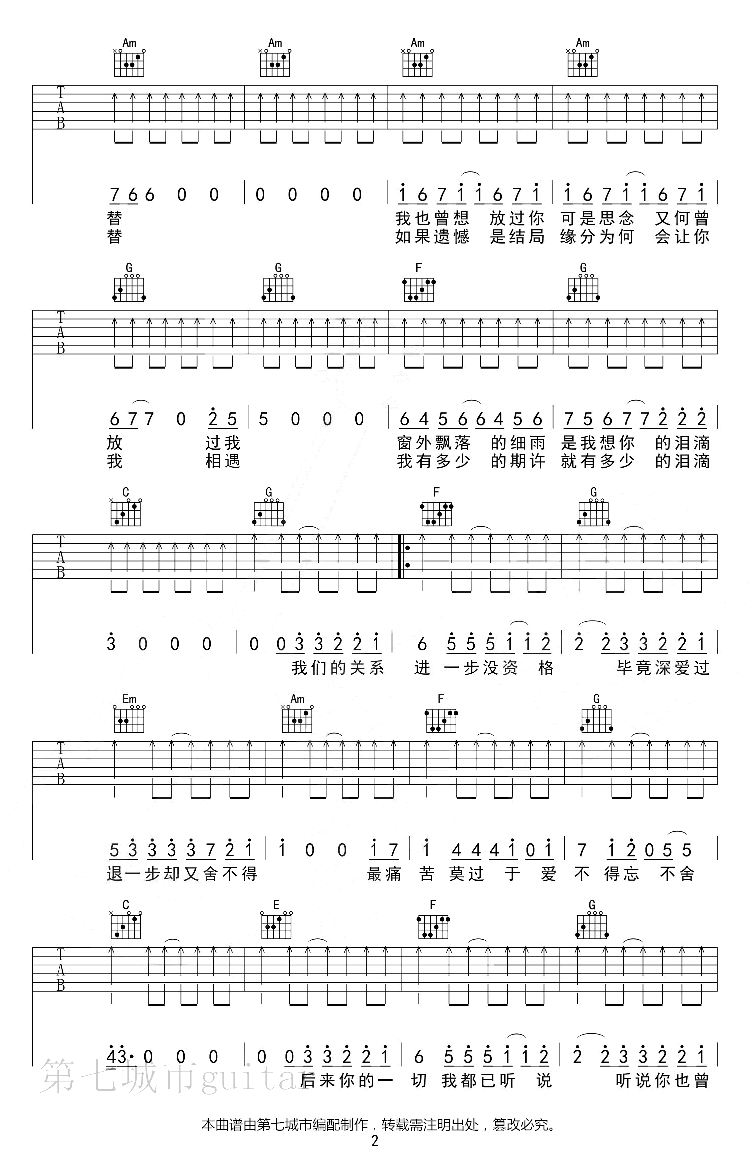 曲谱介绍: 《爱不得忘不舍》吉他弹唱谱,原调升C选调C,CAPO夹一品,三张高清图片六线谱。
