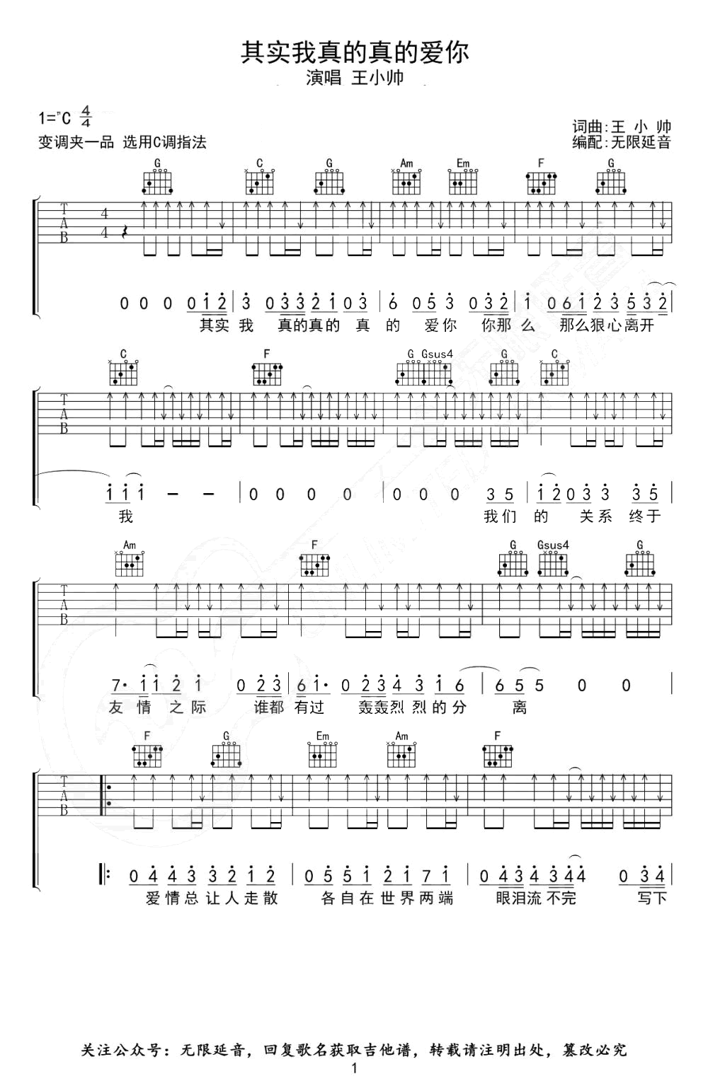其实我真的真的爱你吉他谱 - 王小帅 - C调吉他弹唱谱