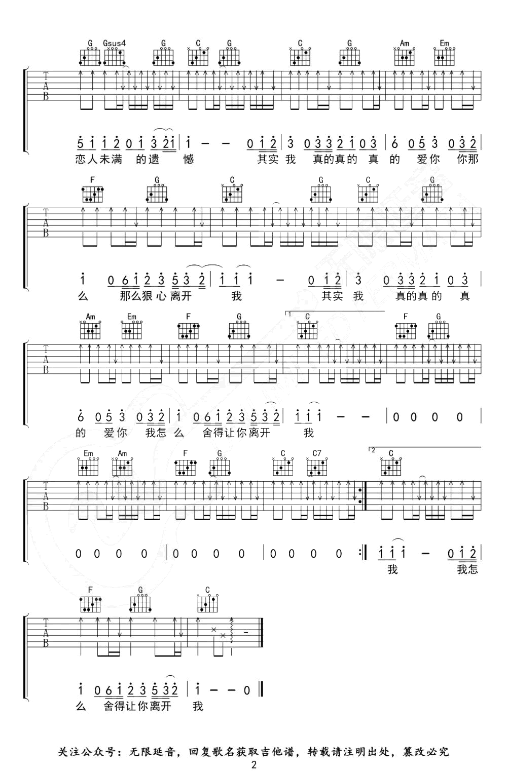 曲谱介绍: 其实我真的真的爱你吉他弹唱谱,原调升C变调夹夹一品,选用C调指法,两张图片六线谱。
