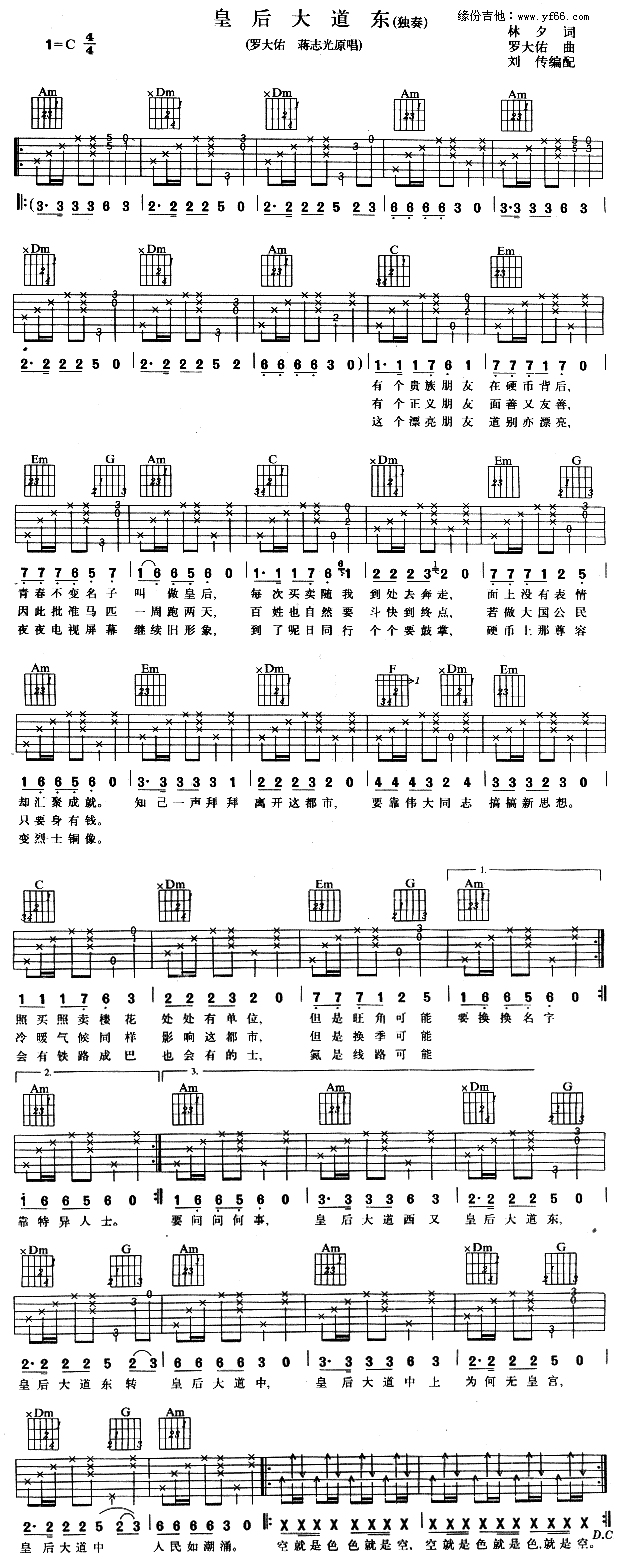 曲谱介绍: 罗大佑《皇后大道东》吉他弹唱谱,采用C调指法编配,共有1张高清图谱,免翻页排版设计。