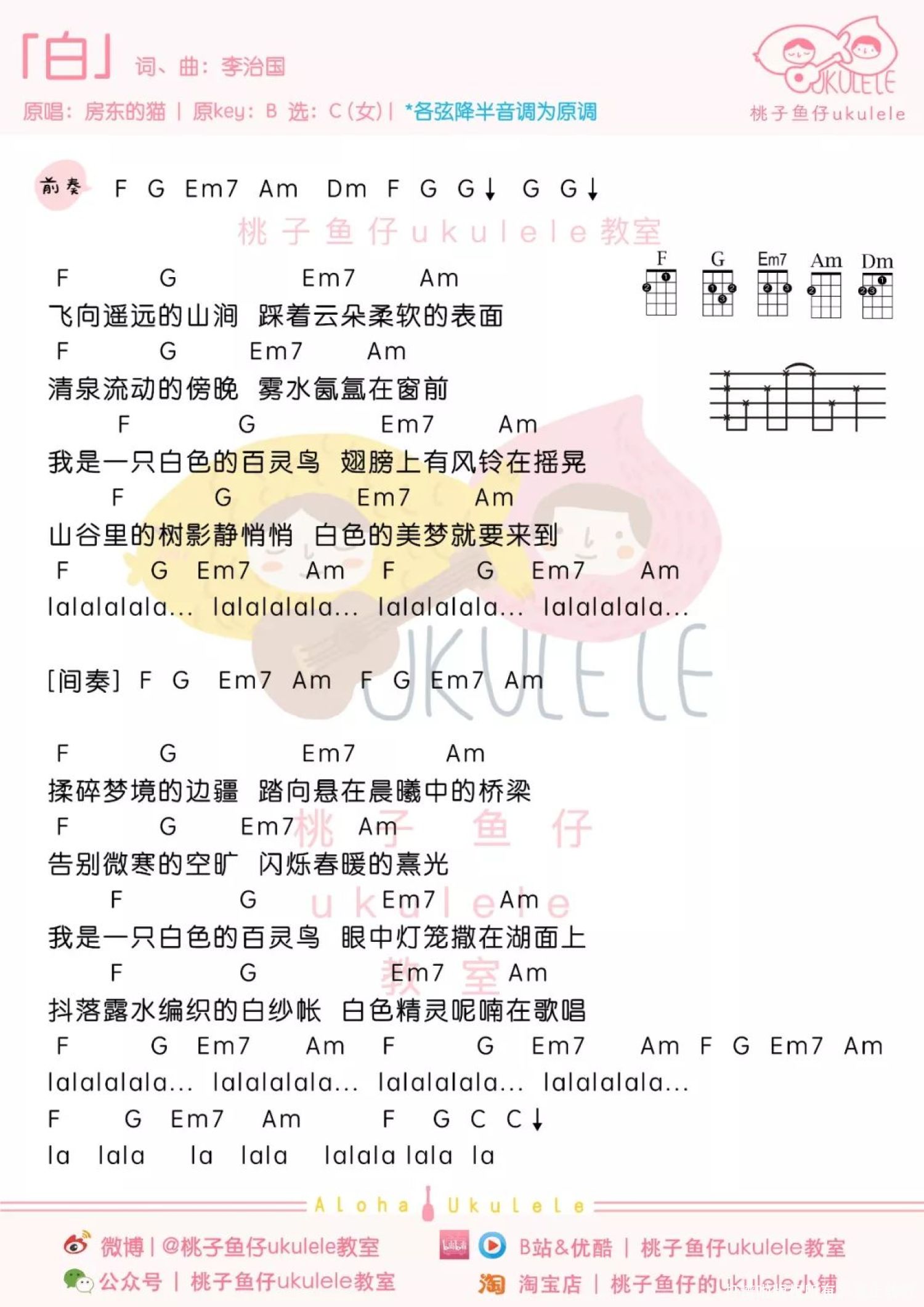 曲谱介绍: 《白》是房东的猫演唱的歌曲 由李治国作词作曲 收录于专辑《柔软》  “白”的拼音和“拜”一样 是告别过去、 迎接新的生活的寓意 在纯白的天地 我们可以画出自己想要的样子   白 尤克里里谱