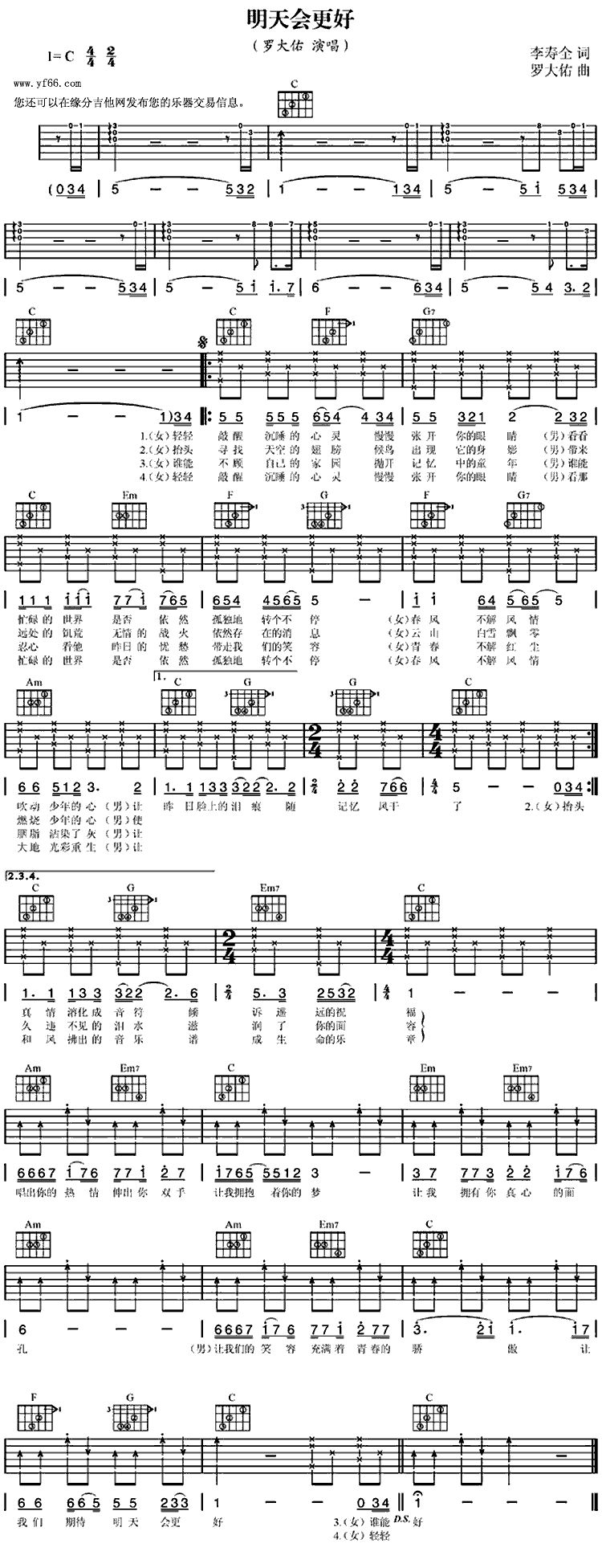曲谱介绍: 罗大佑《明天会更好》吉他弹唱谱,采用C调指法编配,共有1张高清图谱,免翻页排版设计。
