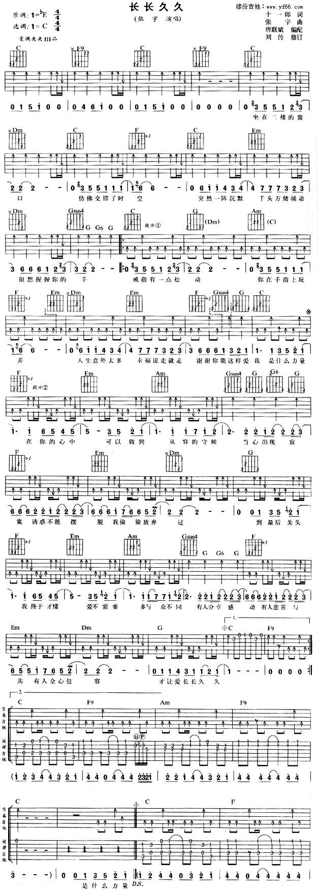 曲谱介绍: 张宇《长长久久》吉他弹唱谱,采用C调指法编配,共有1张高清图谱,免翻页排版设计。