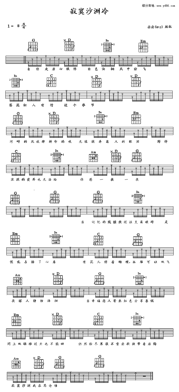 曲谱介绍: 周传雄《寂寞沙洲冷》吉他弹唱谱,采用B调指法编配,共有1张高清图谱,免翻页排版设计。
