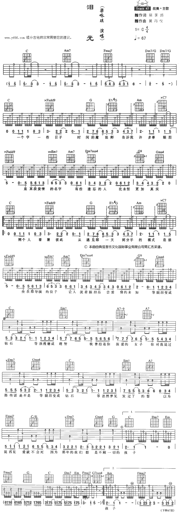 曲谱介绍: 梁咏琪《泪光》吉他弹唱谱,采用C调指法编配,共有1张高清图谱,免翻页排版设计。