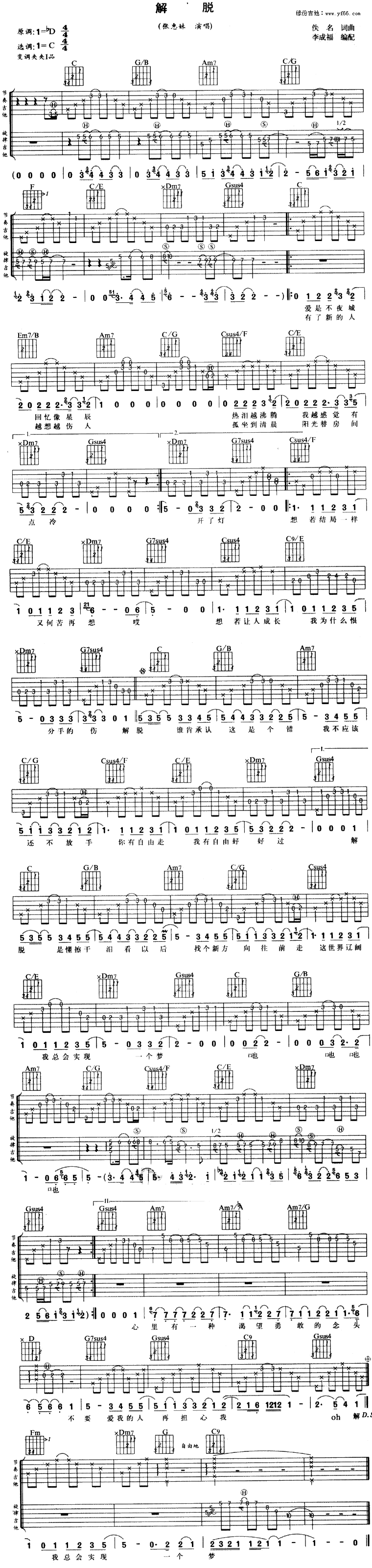 解脱吉他谱 - 张惠妹 - C调吉他弹唱谱
