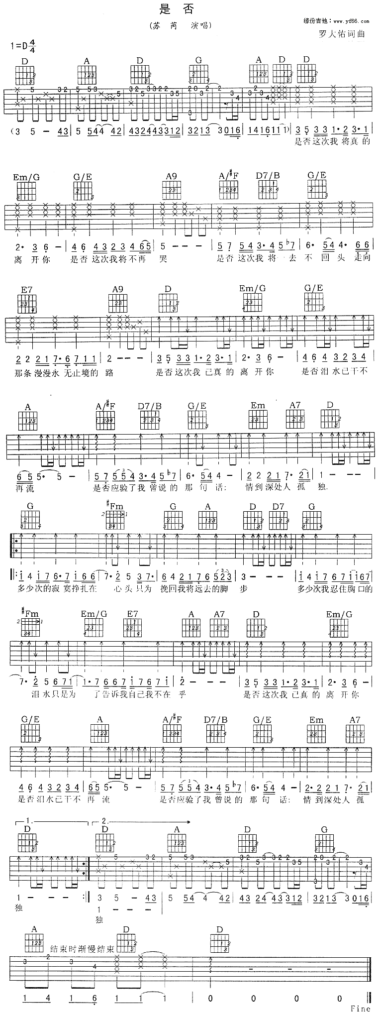 是否吉他谱 - 苏芮 - D调吉他弹唱谱