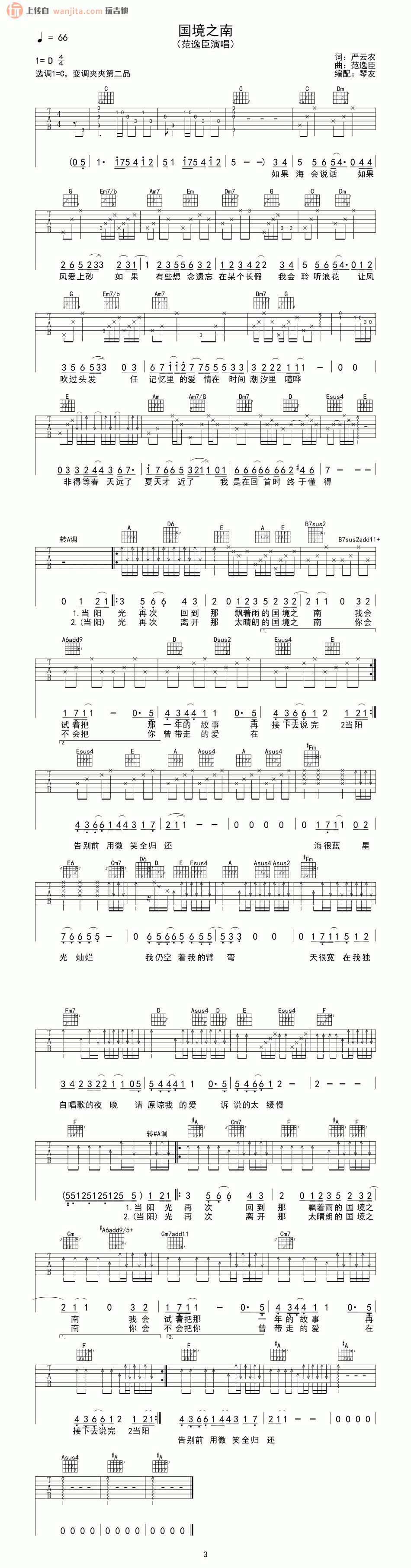 曲谱介绍: 国境之南吉他谱是选用C调编配,变调夹可以夹在第二品。国境之南是范逸臣的一首比较有名的歌曲了,歌词用唯美的手法去追述当时对爱的一些感知。