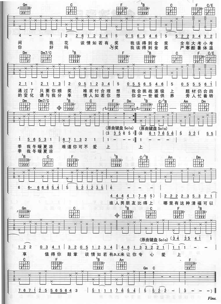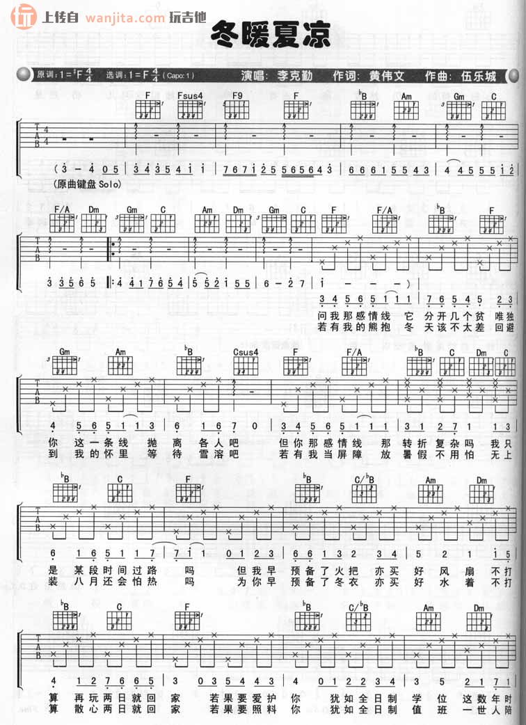 曲谱介绍: 冬暖夏凉吉他谱是李克勤演唱的一首经典歌曲,这个版本选用F调编配,总共2张图片谱。