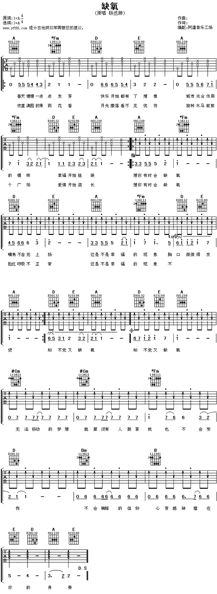 曲谱介绍: 杨丞琳《缺氧》吉他弹唱谱,采用A调指法编配,共有1张高清图谱,免翻页排版设计。