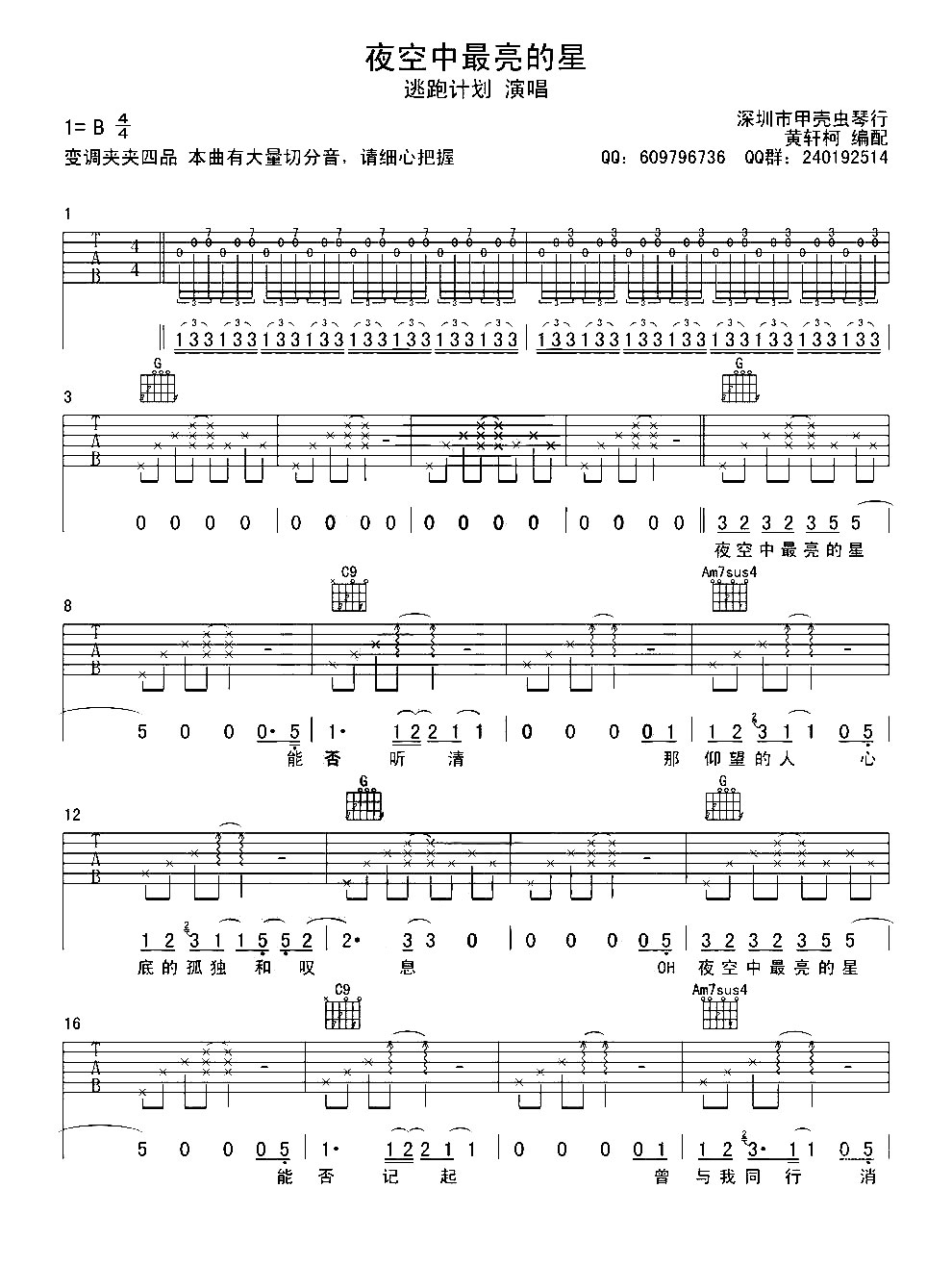 曲谱介绍: 夜空中最亮的星吉他谱是逃跑计划的成名曲,这首歌选用B调编配,变调夹可以夹在第四品,歌曲编配里面有大量的切音,需要细心把我,欠揍部分的重复小节奏比较快,需要多加练习。另外这个版本基本上和原版接近,整体来说还是比较简单。