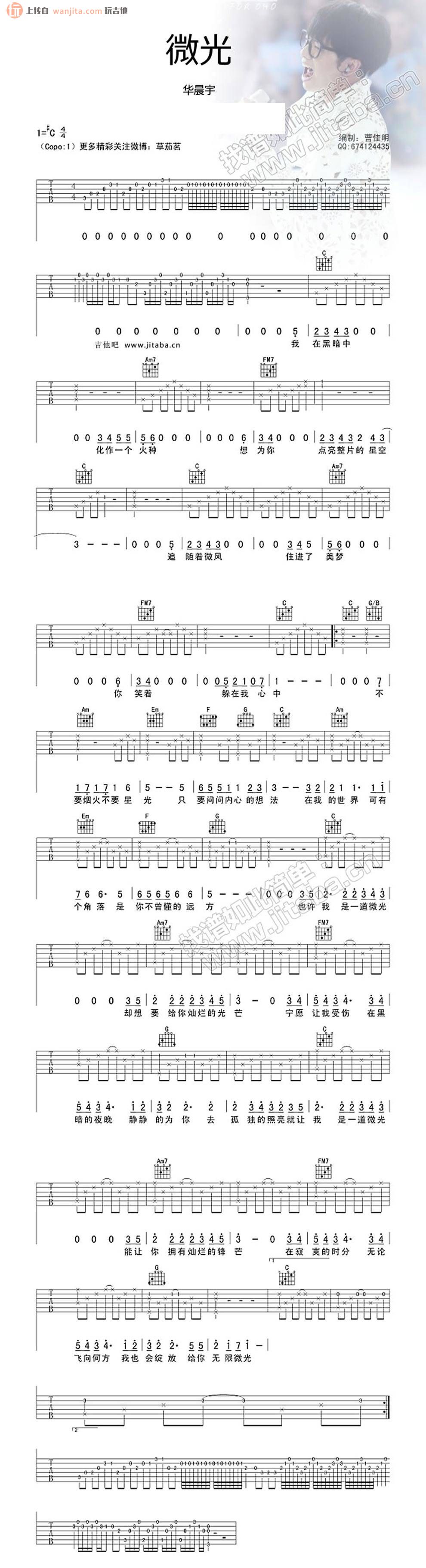 曲谱介绍: 华晨宇《微光》吉他弹唱谱,采用C调指法编配,共有1张高清图谱,免翻页排版设计。