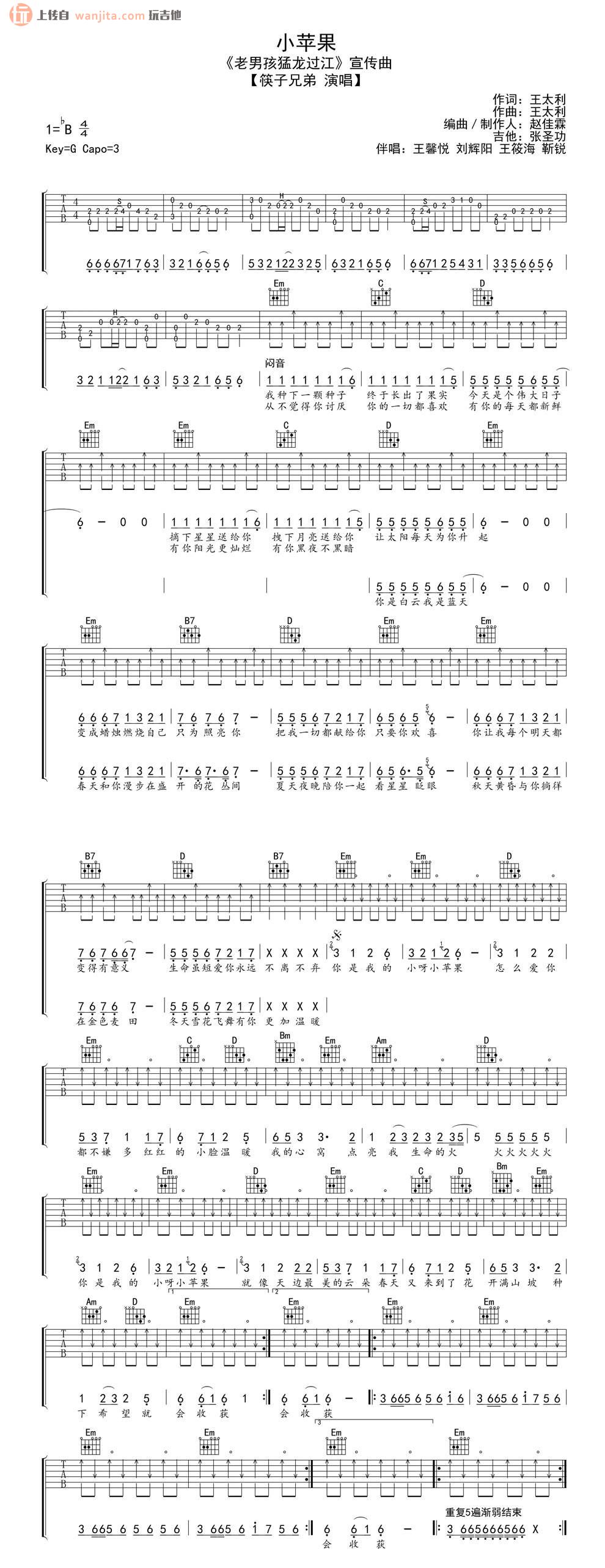 曲谱介绍: 小苹果吉他谱,是筷子兄弟是一首极具代表的作品之一,这个版本的吉他谱选用降b调编配,G调手法弹唱,变调夹夹在第三品处。这首歌曾经火了很长一段时间,大街小巷,大家都在哼着这首歌“你是我的小呀小苹果,怎么爱你都不嫌多”,相信这样的快餐类歌曲看似很普通,却传唱度极高,因为极具辨识度,也容易流行起来。