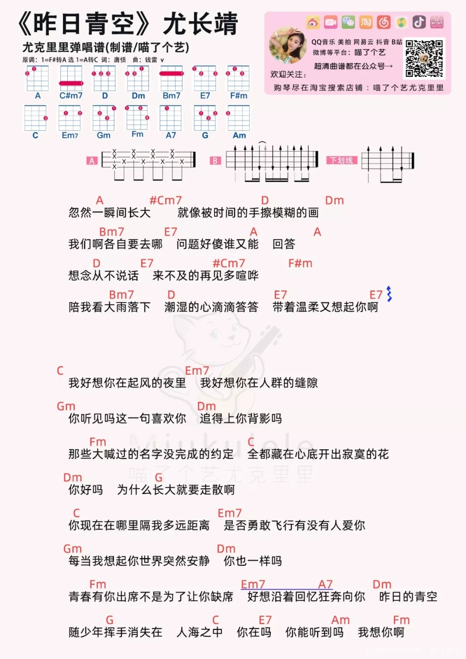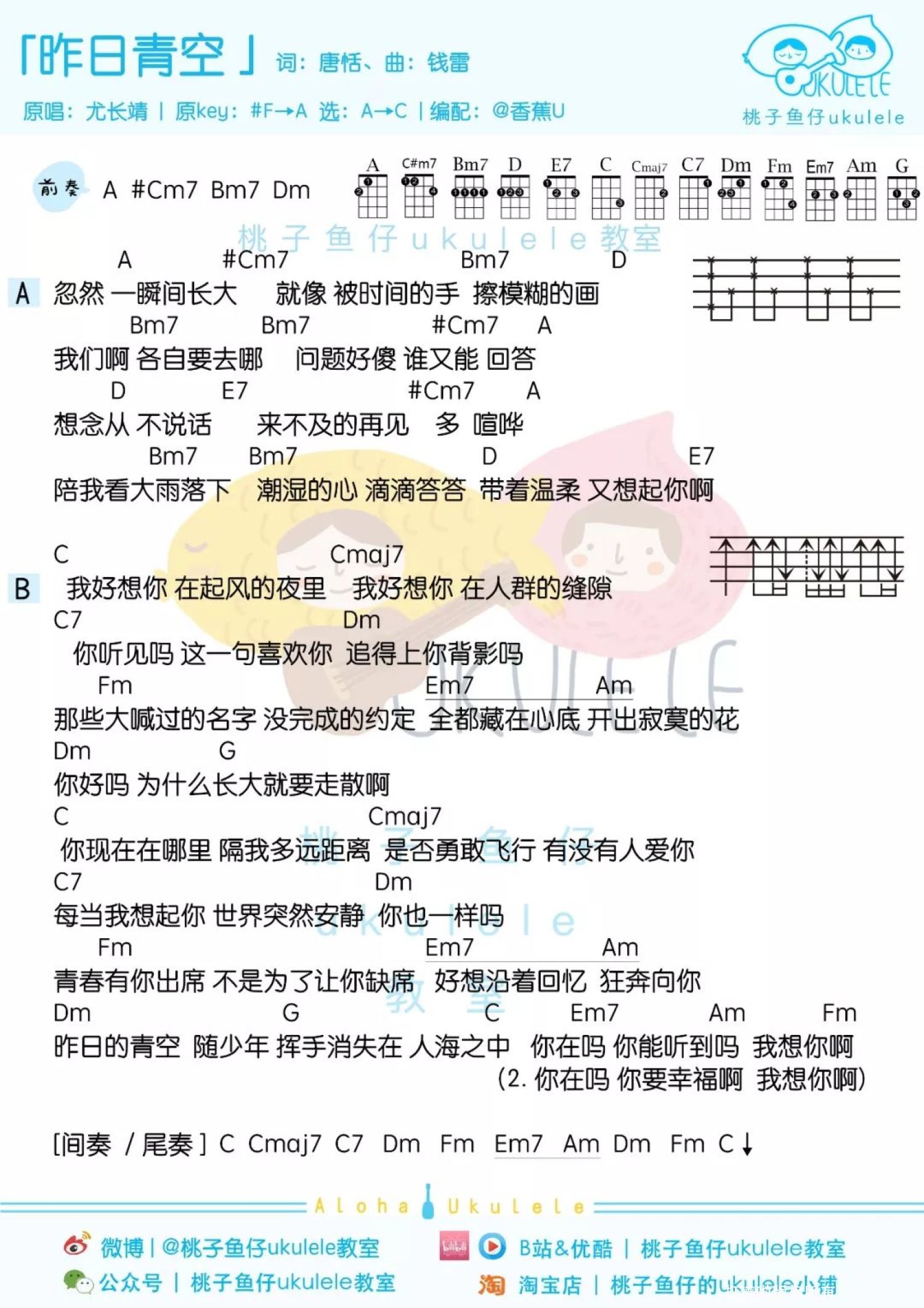 曲谱介绍: 「昨日青空 」尤克里里弹唱谱   昨日清空尤克里里谱 喵了个艺版 单音指弹+简单弹唱传送门: 昨日青空尤克里里谱 简单
