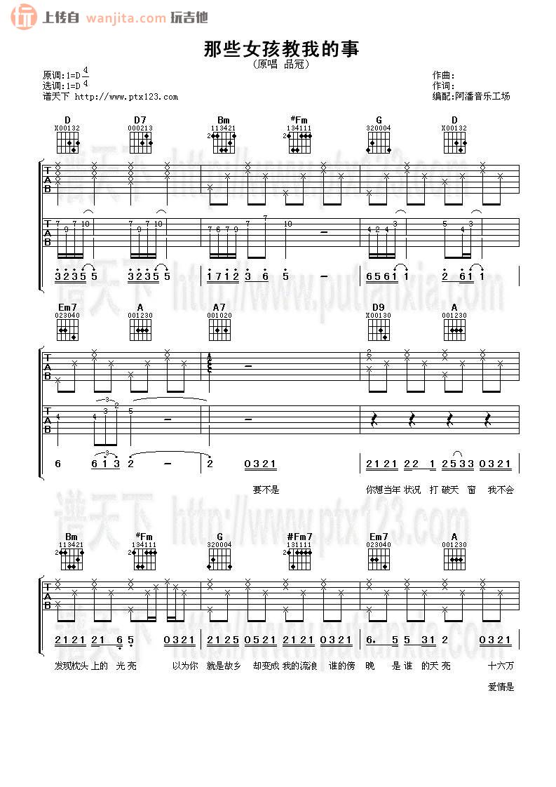 曲谱介绍: 那些女孩教我的事吉他谱_D调弹唱六线谱,中间副歌的切音部分需要掌握一下节奏,这首歌是阿信为品冠量身打造的一首经典情歌,这首歌回忆起来总是那么让人心动,整个旋律的创作非常适合品冠自身的声线,恰拷好处的中频,顺畅的流动性,让品冠的声音显得十分入耳。