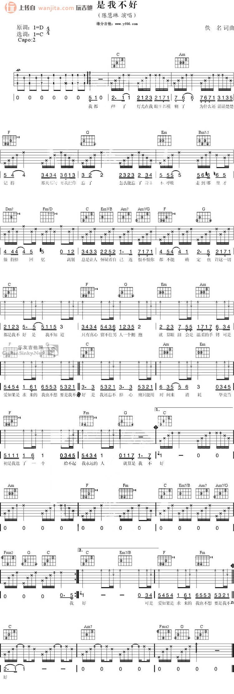 曲谱介绍: 陈慧琳演唱的是我不好吉他谱_D调弹唱六线谱,原调本是D调,这个版本选用的C调编配,变调夹夹在第二品,和弦采用分解式,中间副歌部分选用的扫弦弹奏。