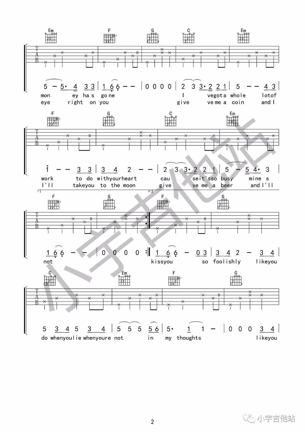 曲谱介绍: Loving Strangers吉他谱_C调弹唱六线谱,是谭秋娟(tiger)在参加中国好声音弹唱过的一首歌曲。原版本是bD调,这个编配选用的C大调指法,变调夹夹在第一品,这首歌和弦非常简单,基本上保留在4个和弦循环,也是为了能够让初学者轻松的谈下来。同时很多有听过这首歌现场版的朋友能够回忆起,在这首英文慢情歌的搭配下,显得画面十分唯美。