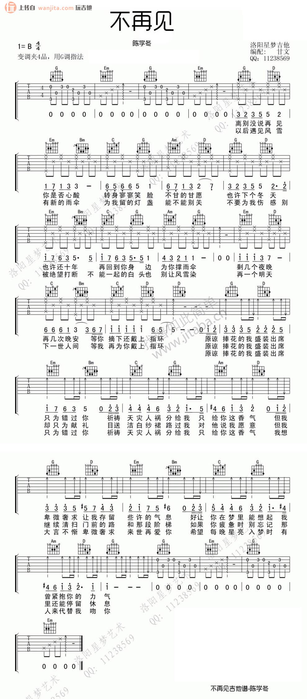 曲谱介绍: 不再见吉他谱_B调高清图片谱是陈学冬演唱的《小时代3:刺金时代》的主题曲,这个版本吉他谱选用B调,用G调指法弹唱,变调夹夹在第四品,和弦比较简单,变换基本上不复杂,新手也可弹唱。刚好这是首洋溢着青春感伤的歌曲,歌名更是一语双关,既有不再见的意思,也表达不想说再见。《不再见》以悲伤舒缓的曲风引领全场观众重温那个“最好也是最坏”的时代。