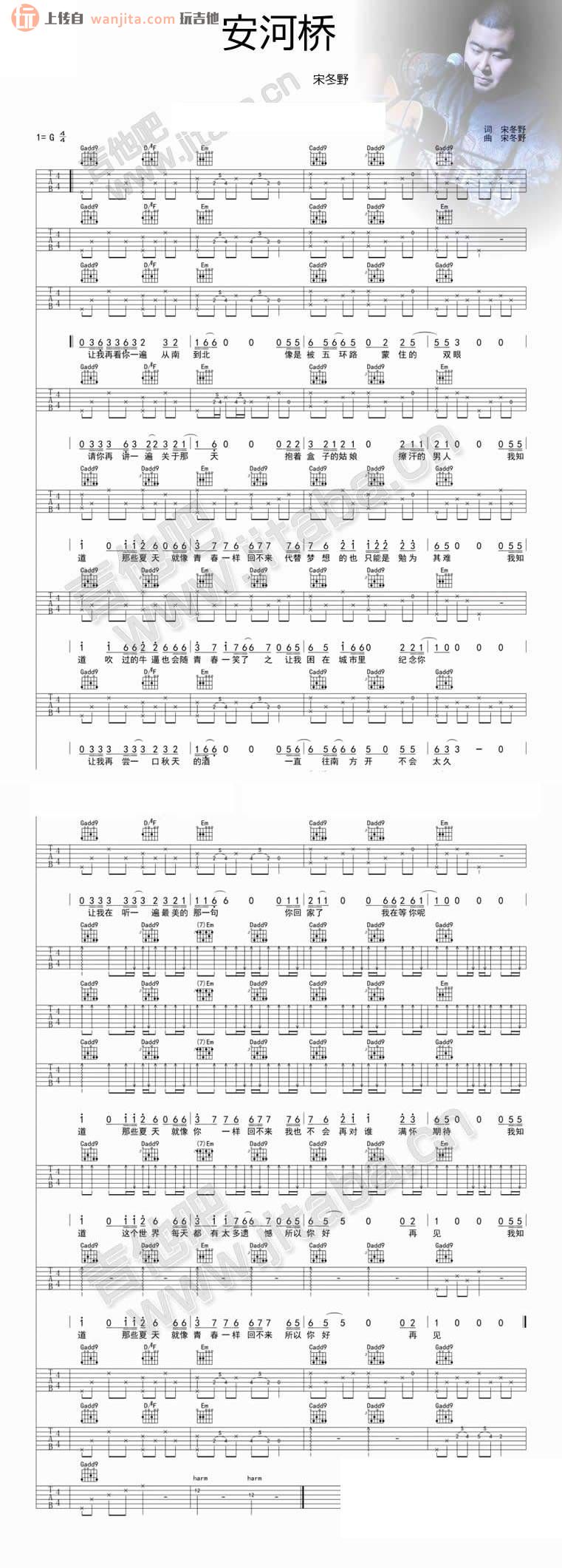 曲谱介绍: 安河桥吉他谱_G调弹唱六线谱是宋冬野创作演唱的歌曲,算是民谣界非常火的一首经典曲目了。总共一张高清图片谱。