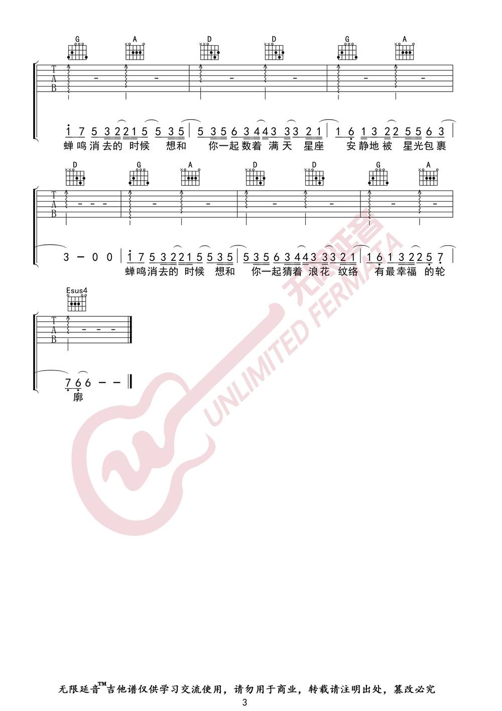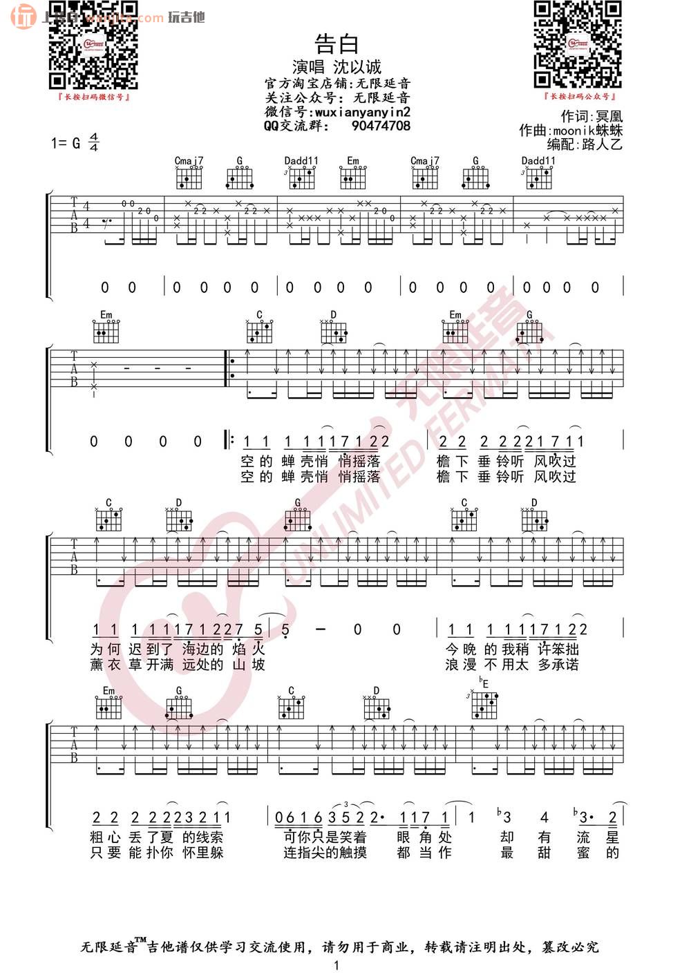 曲谱介绍: 沈以诚《告白》吉他弹唱谱,采用G调指法编配,共有3张高清图谱。