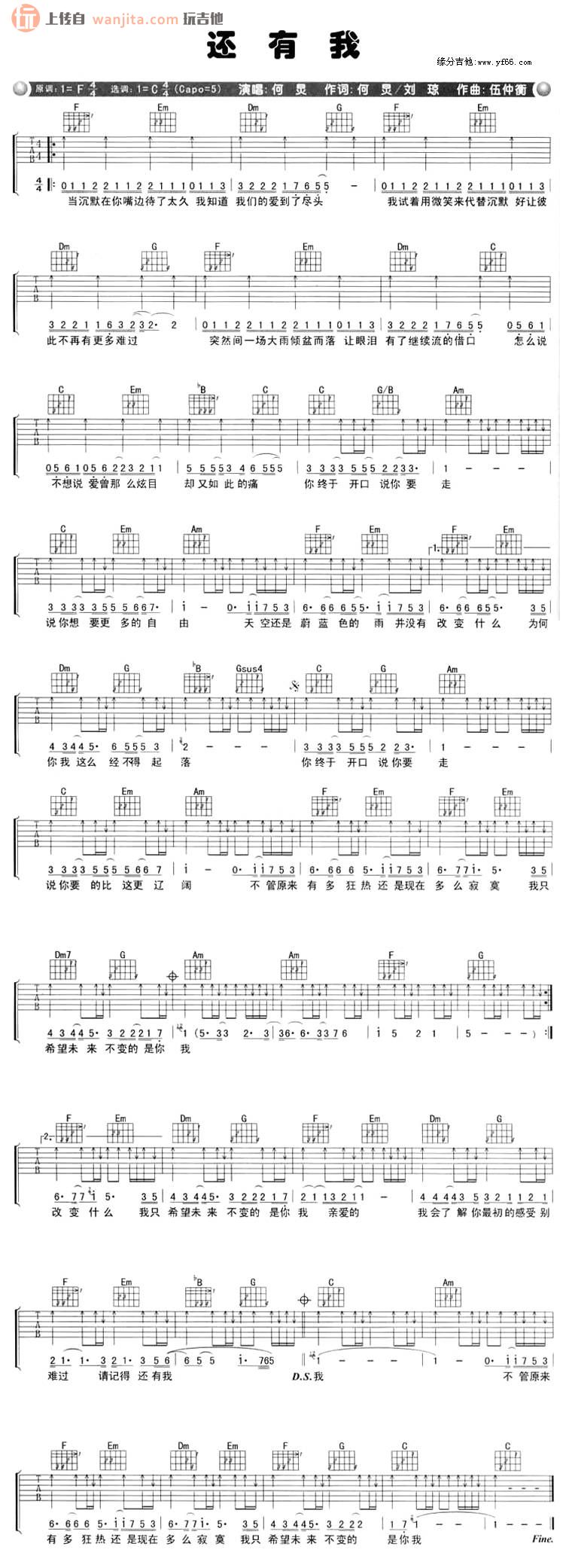 曲谱介绍: 还有我吉他谱_弹唱六线谱_图片谱原调F调,选用C调指法,变调夹夹在第五品,这个版本,主要是以扫弦为主。