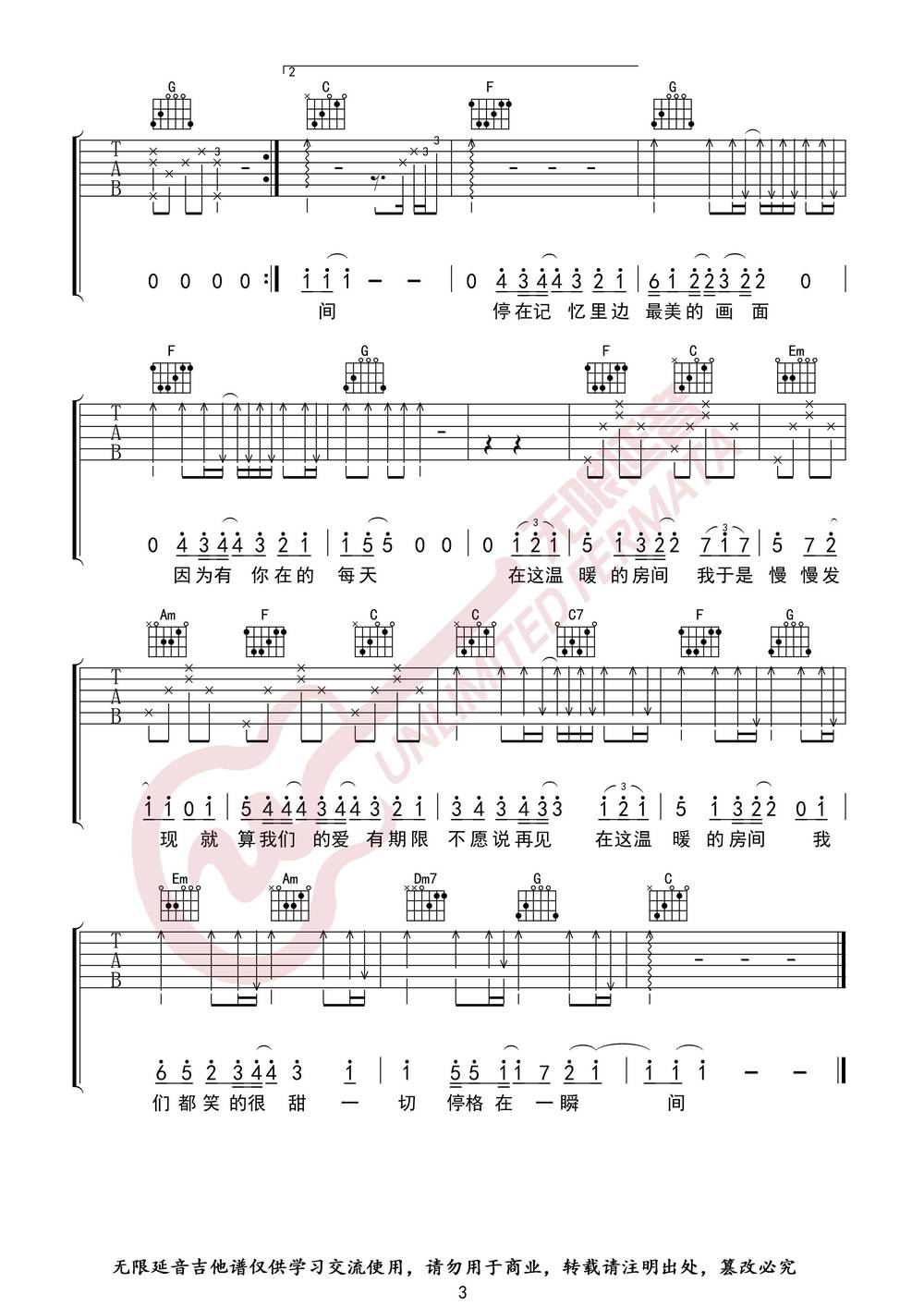 曲谱介绍: 房间吉他谱_C调弹唱六线谱_图片谱是刘瑞琪演唱的一首歌,这首歌是电影超时空同居里面的插曲,很多看过电影的朋友都知道,这首歌十分的悲情的抒情慢歌,在这温暖的房间,我于是慢慢发现,就算我们的爱有期限,不愿说再见。
