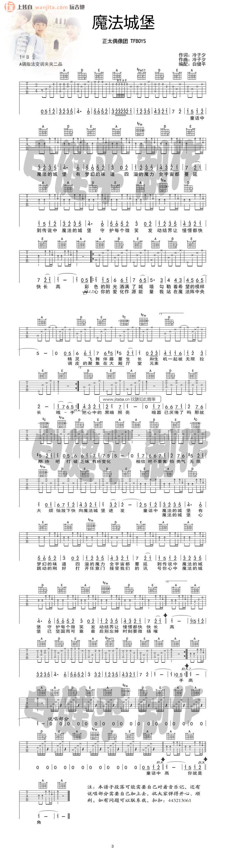 曲谱介绍: TFBOYS演唱的魔法城堡吉他谱,总共一张图片谱,这个版本选用B调,使用A调指法弹唱,变调夹夹在第二品位置处。另外,本谱子可能需要自己对着音乐记,还有说唱部分需要自己加上去。歌曲用魔法般的童话世界描绘,能让很多童真的孩童喜欢这梦幻的感觉。