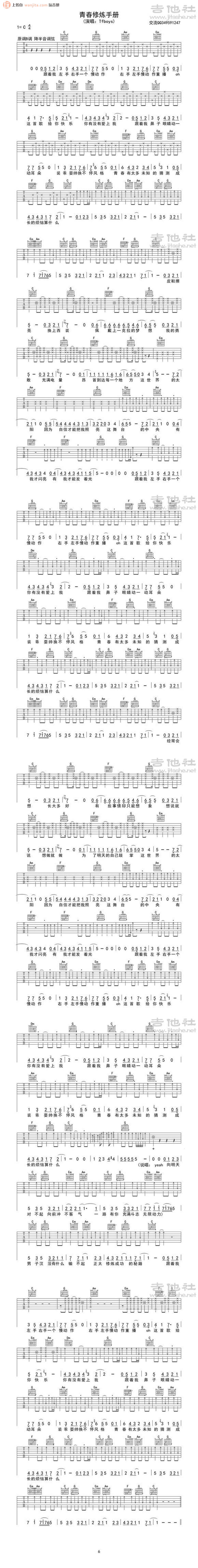 曲谱介绍: 青春修炼手册吉他谱_C调弹唱六线谱是TFBOYS的成名曲之一,这个版本选用C调编配,原调B调,降半音调弦,整体来说比较简单,注意一下扫弦的切音部分。这首歌旋律活力朗朗上口,小朋友们十分喜欢,就连很多大朋友也都常常哼起了这首歌“跟着我左手右手一个慢动作”
