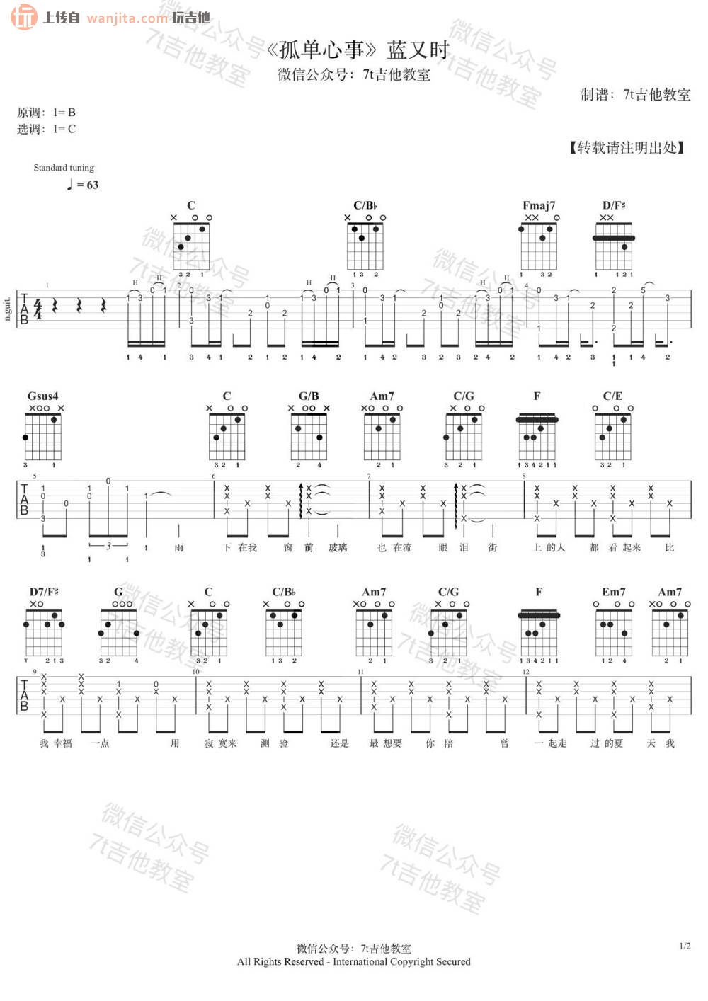 孤单心事吉他谱 - 蓝又时 - C调吉他弹唱谱