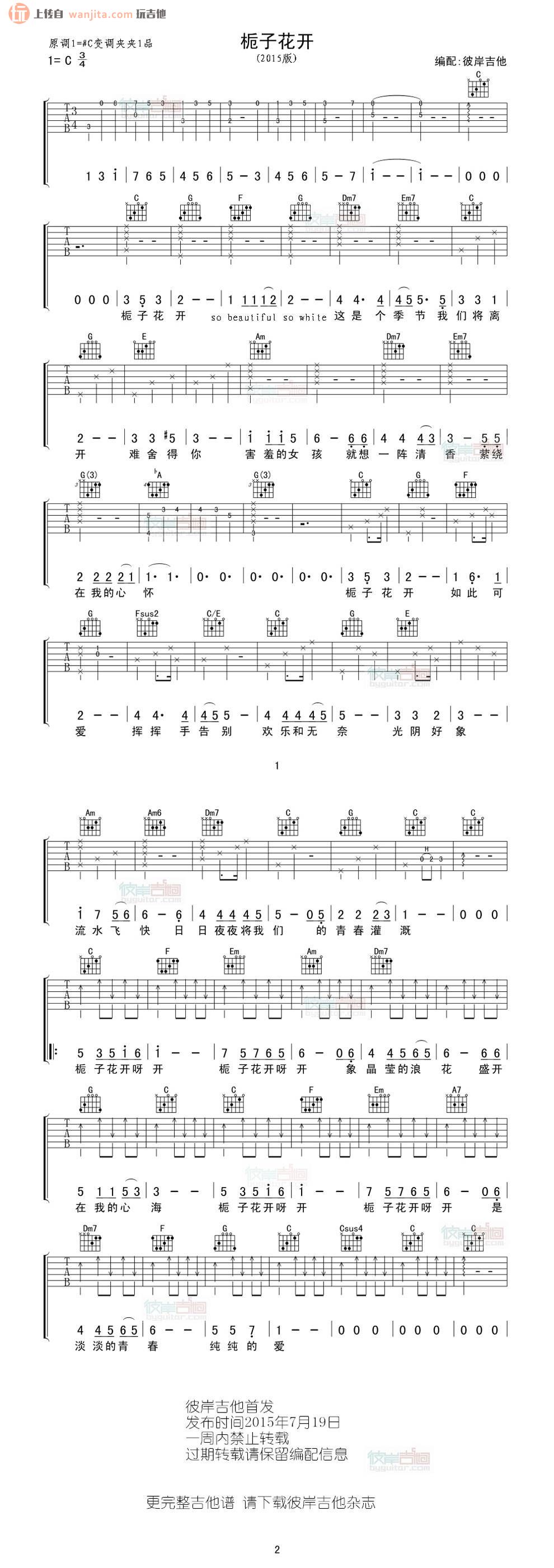 曲谱介绍: 栀子花开算是何炅老师演唱的一首非常甜美的经典青春爱情歌曲了,也非常好听,非常校园风,原调是#C调,这个版本选用的C调指法,变调夹夹在第一品。彼岸吉他提供编配。