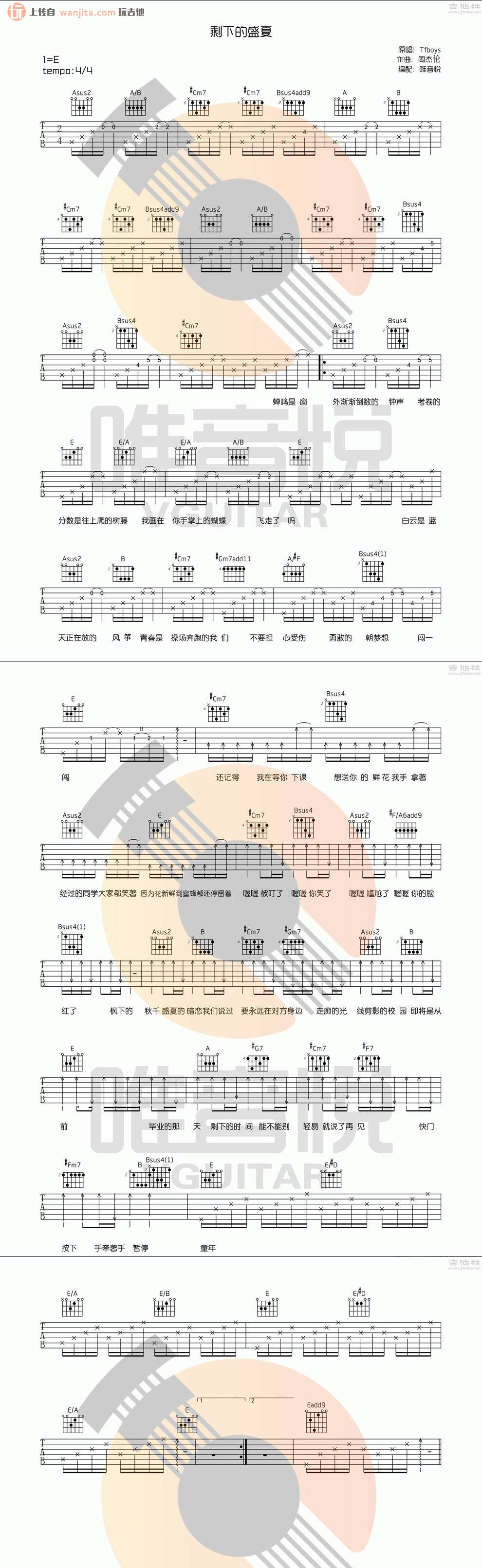 剩下的盛夏吉他谱 - TFBOYS - E调吉他弹唱谱