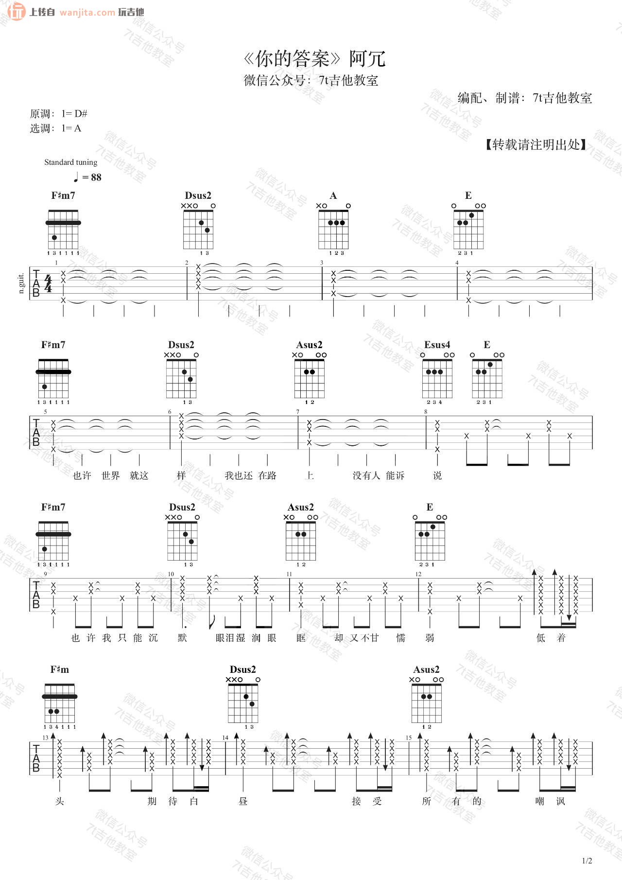 曲谱介绍: 阿冗《你的答案》吉他弹唱谱,采用A调指法编配,共有2张高清图谱,免翻页排版设计。