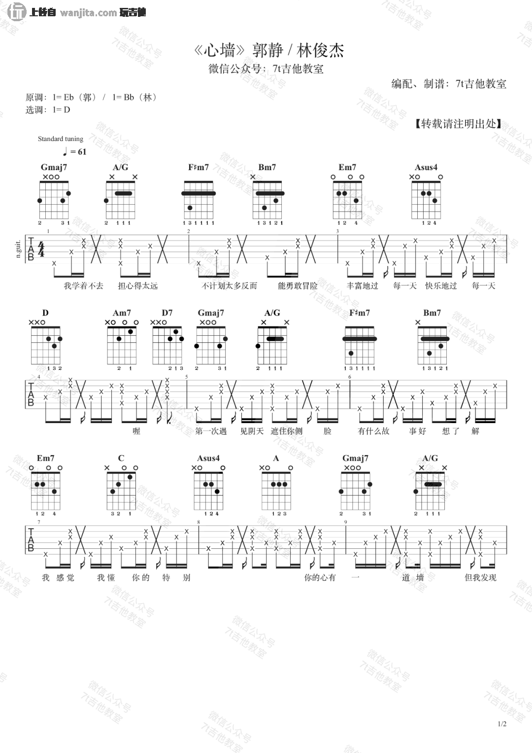 曲谱介绍: 郭静《心墙》吉他弹唱谱,采用D调指法编配,共有2张高清图谱,免翻页排版设计。