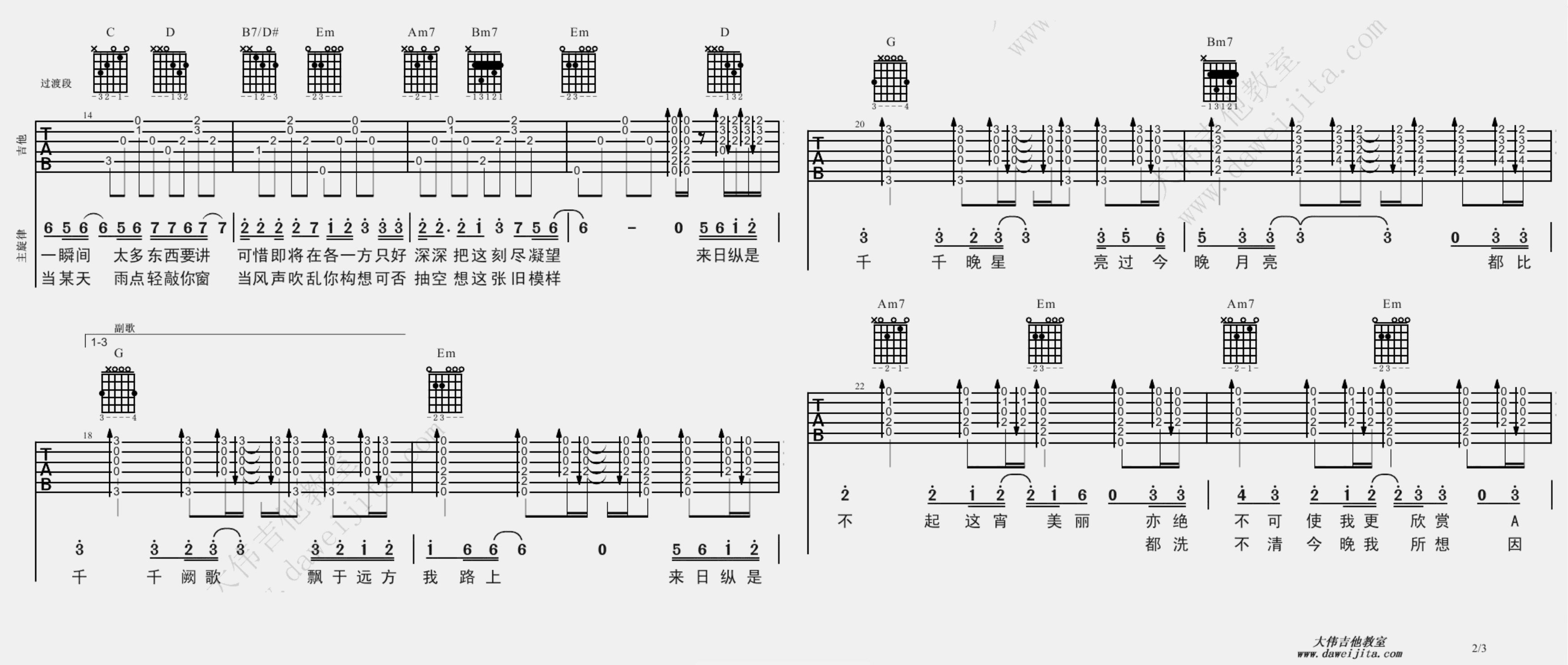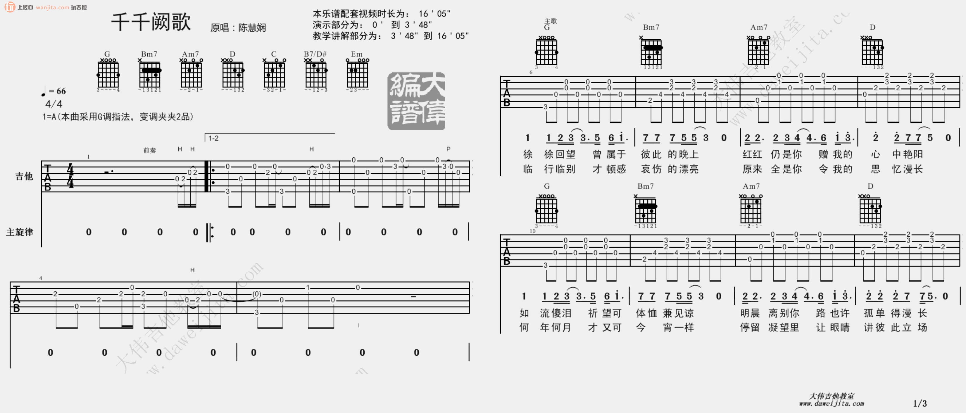 曲谱介绍: 《千千阙歌》吉他谱是,这个版本是非常经典的歌曲,陈慧娴原唱,曾经张国荣的翻唱也非常经典,原调是A调,本谱子由大伟吉他提供,采用G调指法,变调夹夹在第二品。