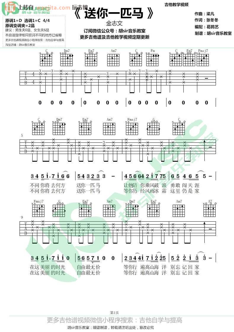 曲谱介绍: 送你一匹马吉他谱_C调弹唱六线谱是金志文演唱的一首歌曲,原调是D调,选调是C调,原调可以夹在变调夹第二品位置,整个和弦比较简单易上手。