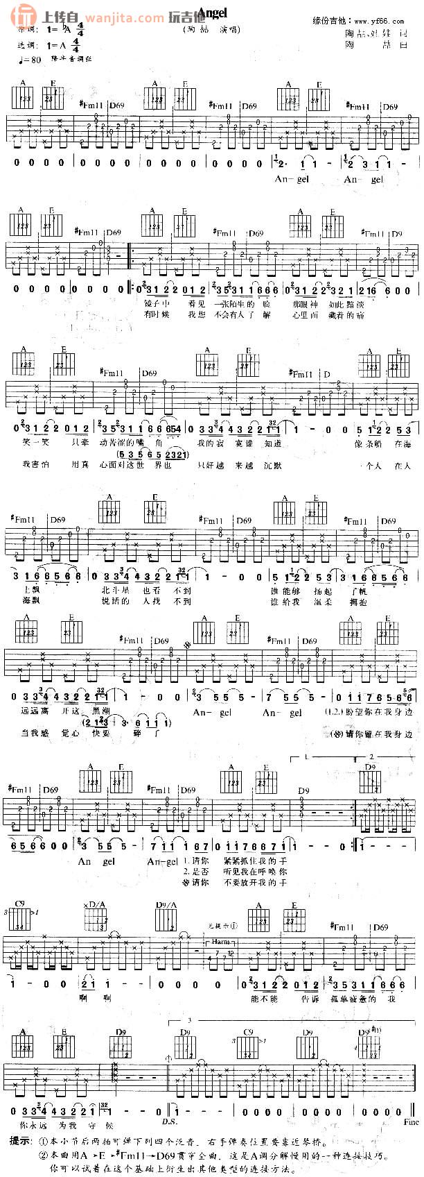 曲谱介绍: Angel吉他谱_A调弹唱六线谱,请降半音调弦,这首歌是陶喆早期创作的一首经典慢歌,也非常抒情,和弦部分编配不算变化很大,整体弹奏起来应该没有太大难度。